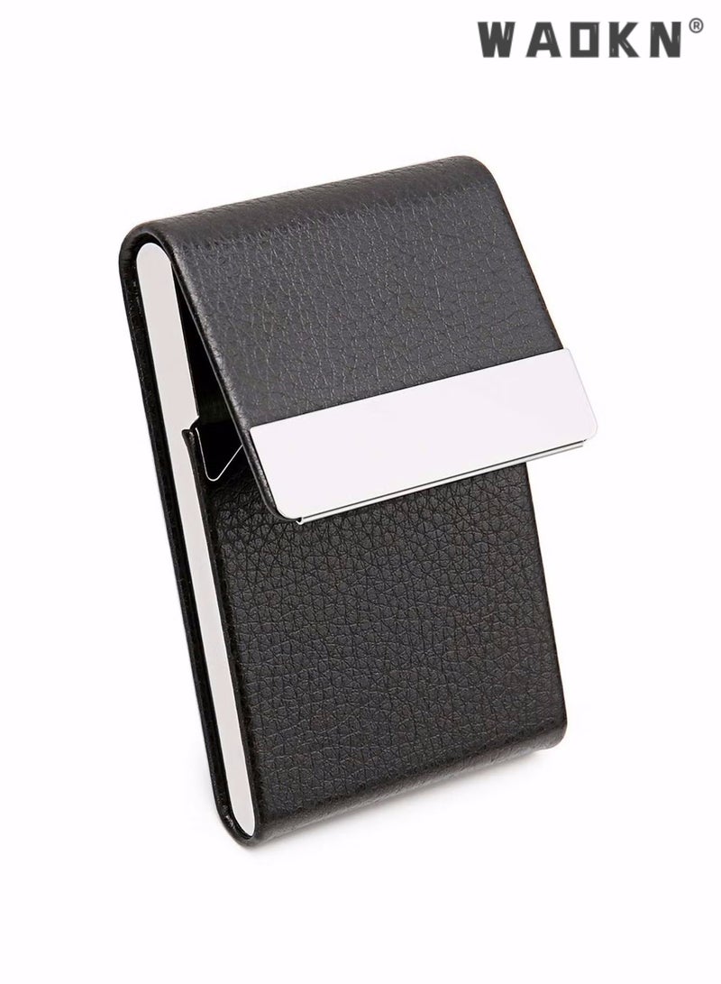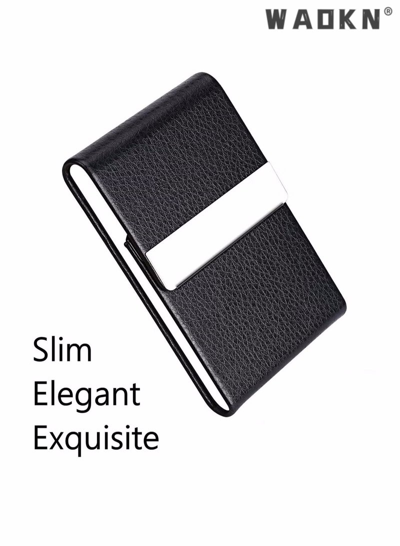 Business Card Holder Case Black Fashion Professional PU Leather Business Card Carrier Luxury Metal Name Card Holder with Magnetic Shut Wallet Credit Card ID Case for Men Women Best Gift Black