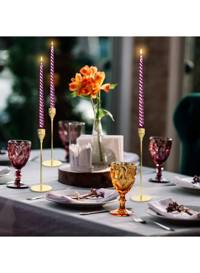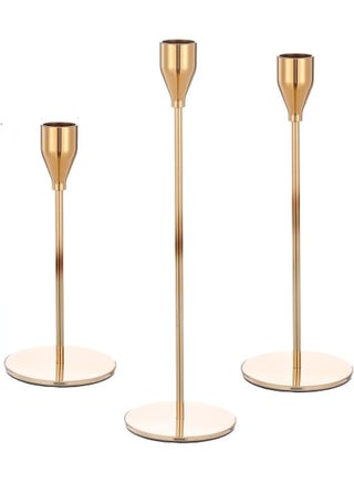 Bring warmth, luxury, and elegance to your space with this Set of 3 Gold Metal Candle Holders, designed to fit standard 3/4" taper or LED candles. Each holder is crafted from sturdy iron with a radiant yellow-gold finish, combining durability with a sophisticated shine. The three varying heights create an eye-catching layered arrangement that enhances dining tables, wedding centerpieces, church altars, or home displays. With smooth edges, a stable round base, and rust-resistant coating, these holders ensure both beauty and safety. Their modern minimalist design makes them versatile enough to complement both festive and everyday settings. Whether for a romantic dinner, elegant event, or holiday celebration, these gold candlestick holders add timeless charm and brilliance to any decor