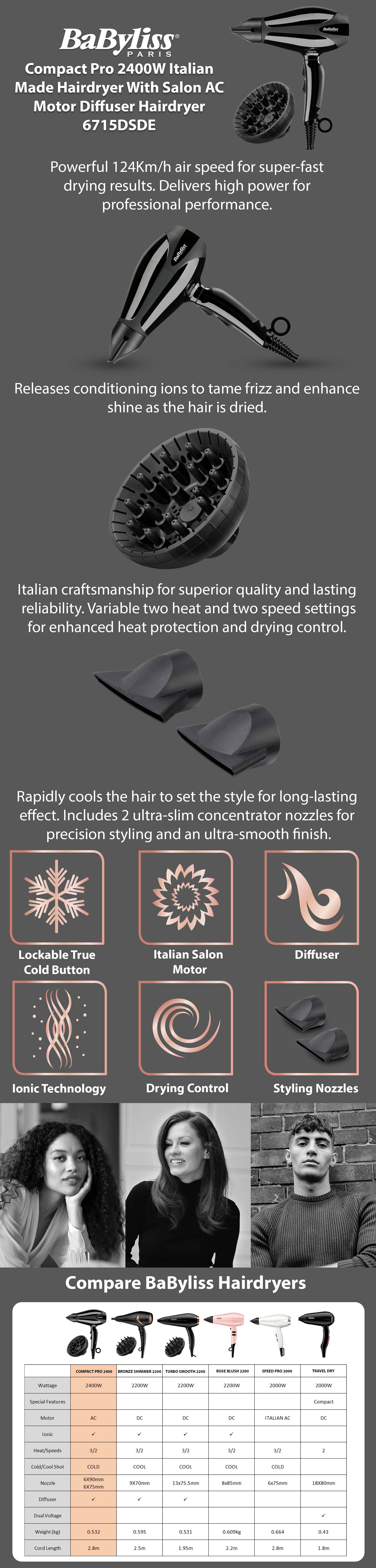 "BaByliss Compact Pro 6715DSDE Hair Dryer. Motor type: AC, Air speed: 34.4 m/s, Airflow: 124 m³/h. Product colour: Black, Surface coloration: Monotone, Hanging type: Hanging ring. Power: 2400 W. Weight: 532 g. Package type: Box Weight & dimensions -Weight: 532 g Power -Power: 2400 W Packaging data -Package type: Box Packaging content -Concentrator nozzle: Y -Diffuser nozzle: Y -Concentrator nozzle width: 7.5 cm -Concentrator nozzle height: 6 mm Design -Product colour: Black -Surface coloration: Monotone -Hanging type: Hanging ring -Cord length: 2.8 m -Swivel cord: Y -Removable filter: Y -Country of origin: Italy Performance -Cool shot function: Y -Ionic function: Y -Number of speeds: 2 -Number of heating levels: 3 -Ceramic heating system: Y -Motor type: AC -Air speed: 34.4 m/s -Airflow: 124 m³/h