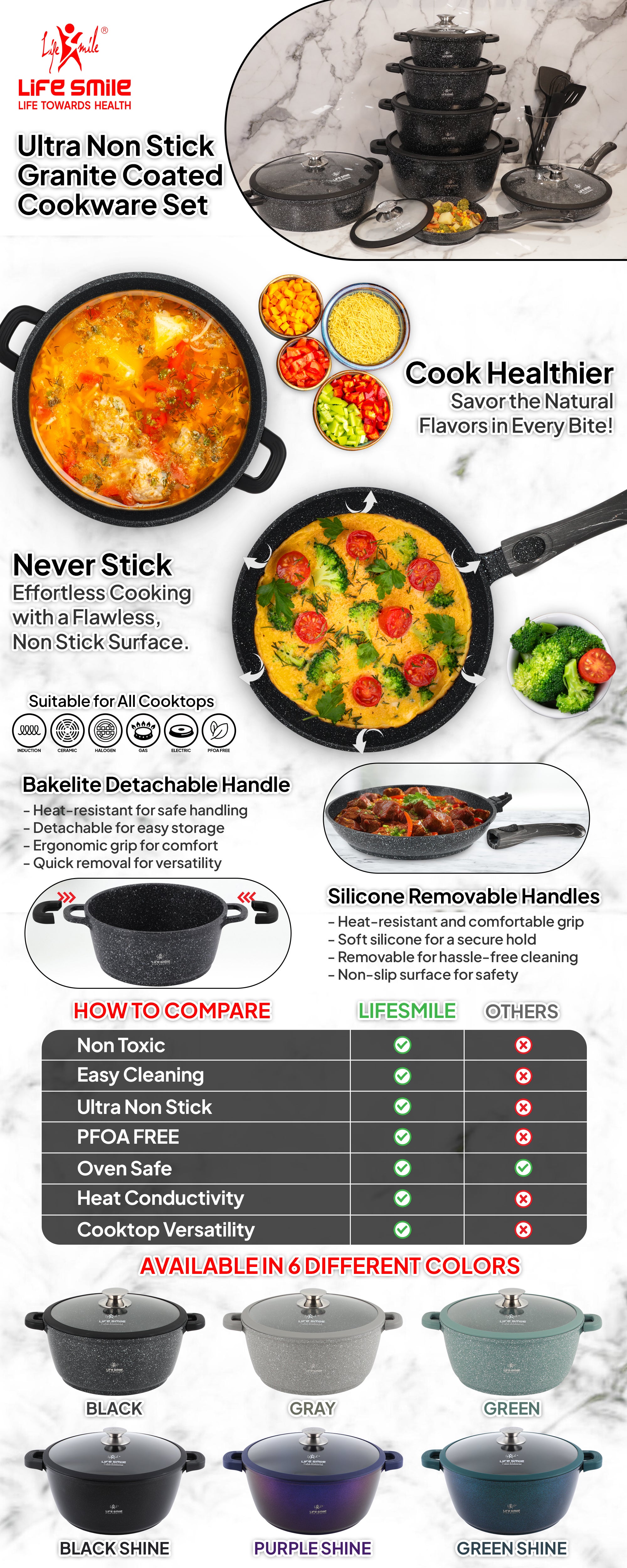 Life Smile products are designed to make healthy, diet-friendly cooking effortless while adding elegance to your kitchen. Made from premium-quality cast aluminum, they ensure even heat distribution and lasting durability.