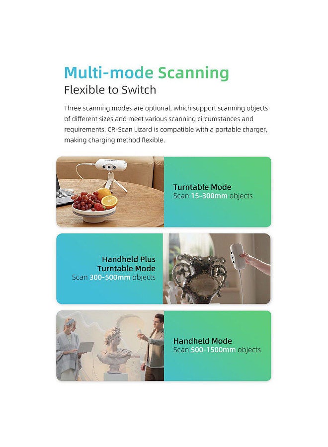 Multi-mode Scanning - 3 scanning modes are optional, which support scanning objects of different sizes and meet various scanning circumstances and requirements. CR-Scan Lizard is compatible with a portable charger, making charging method flexible.