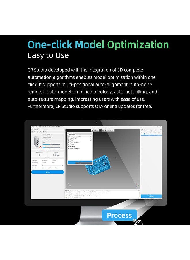 Easy to Use - CR Studio developed with the integration of 3D complete automation algorithms enables model optimization within one click! It supports multi-positional auto-alignment, auto-noise removal, auto-model simplified topology, auto-hole filling, and auto-texture mapping, impressing users with ease of use.