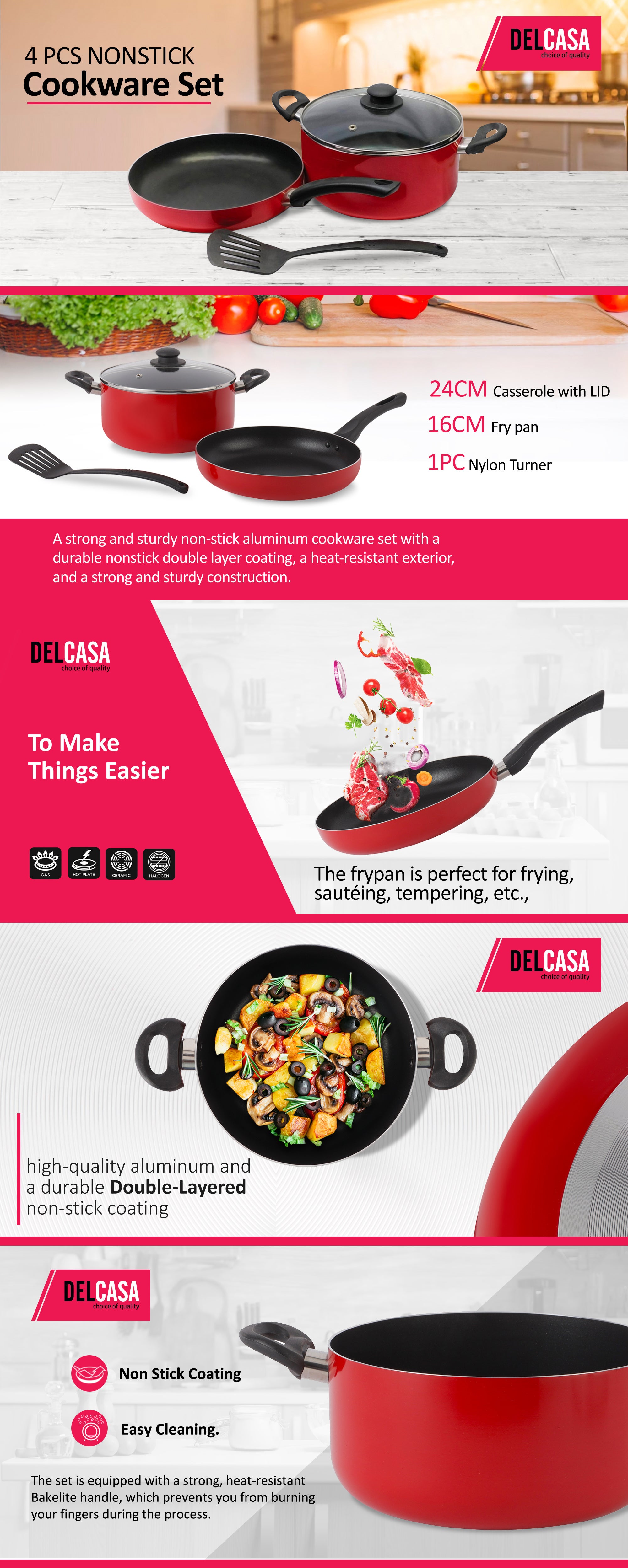 Effortless cooking at your fingertips. The Delcasa 4-piece aluminum nonstick set is a very durable, strong, and easy to clean set that is an excellent addition to your collection. Designed with high quality aluminum and a durable double layered non stick coating, this set distributes heat evenly while cooking. The set includes a 24 cm casserole with lid, a 26 cm frypan, and a nylon turner, so you can easily prepare a variety of dishes. They are made of sturdy aluminum with a non toxic, non stick coating, and they have a flat bottom for efficient cooking. With the non stick coating, you can enjoy long lasting cooking with minimal oil or ghee. The high heat retention capacity and durability enable years of healthy cooking. The set features a heat resistant Bakelite handle with a soft touch that offers safety, making them easy to use for beginners. The pan has a top quality nonstick coating that ensures easy food release and easy cleanup. This set is a good choice for you and your family because it is versatile and has a wide range of uses. The frypan is suitable for shallow frying, deep frying, sauting, searing, tempering, etc. The set also includes a casserole, which is appropriate for making sauces, soups, or tasks like stewing, simmering, and boiling water. The frypan is suitable for preparing eggs, fish fries, chicken fries, pancakes, and toasting bread. In addition, the nylon turner is most suitable for flipping and transferring food without damaging the non stick coating. Its robust body and utility features make it convenient to use. This set is compatible with hot plates on halogen, ceramic, and gas cooktops. It offers hassle free cooking with easy cleaning and low maintenance. It features a modern design, a stylish red color, and long lasting durability, making it a thoughtful gift option. Prepare healthy and tasty meals with this stylish aluminum non stick cookware set. The set weighs only 1.913 kg.