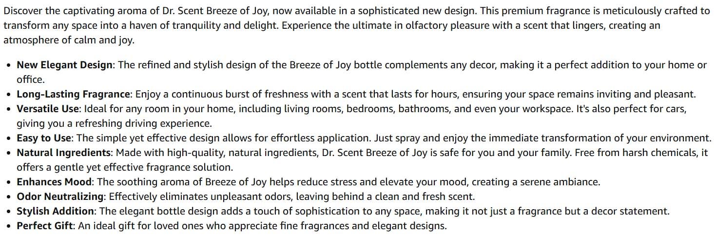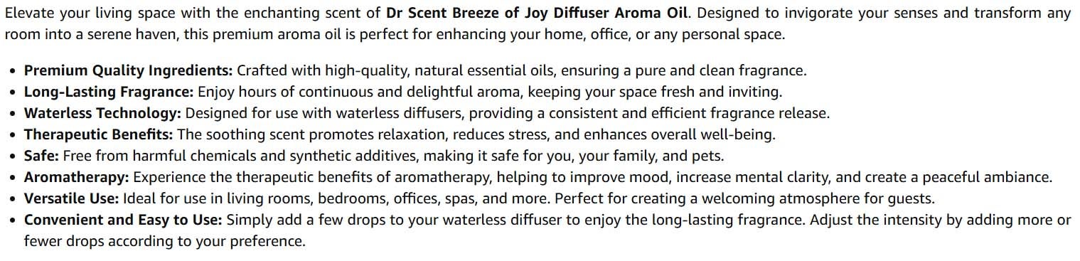 Dr Scent Breeze of Joy Diffuser Aroma Address features a luxurious blend of velvet cedar, refreshing citrus, and rich cedarwood, creating a sophisticated and long-lasting fragrance. Crafted in the UK with high-quality ingredients, this diffuser is perfect for enhancing the ambiance of homes, offices, shops, hotel rooms, and small lobbies. The 170ml diffuser delivers continuous fragrance, promoting relaxation, rejuvenation, and mental clarity while complementing any decor with its elegant design.