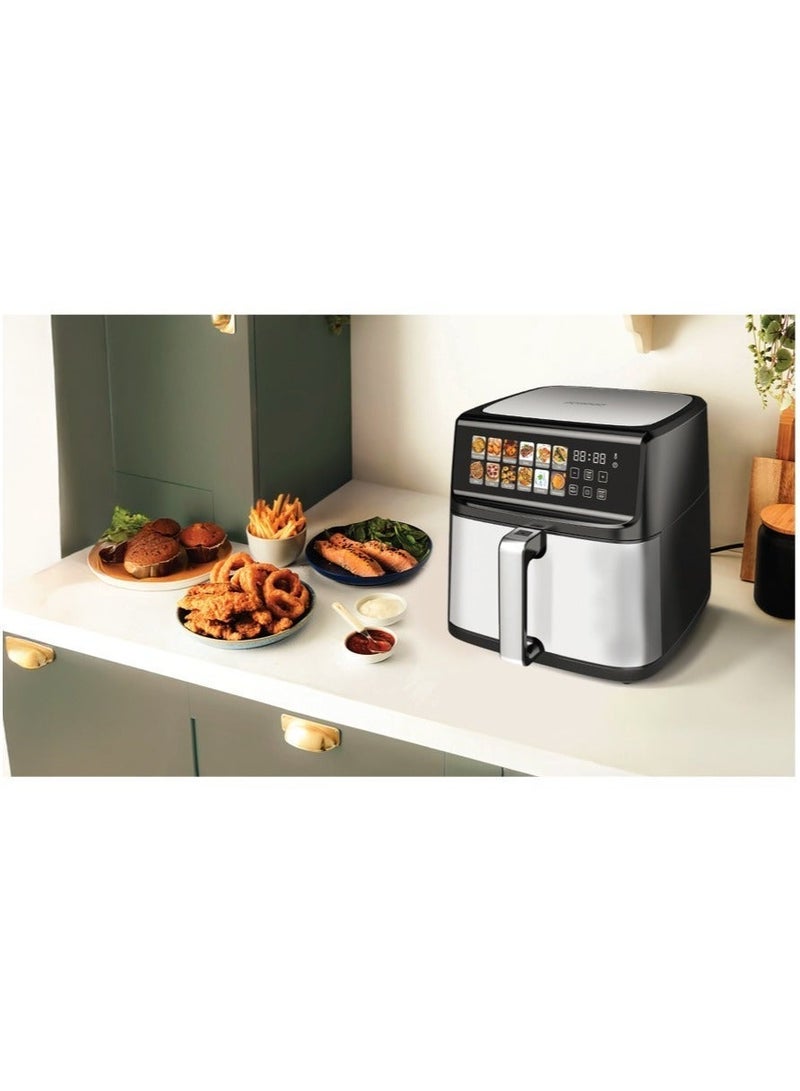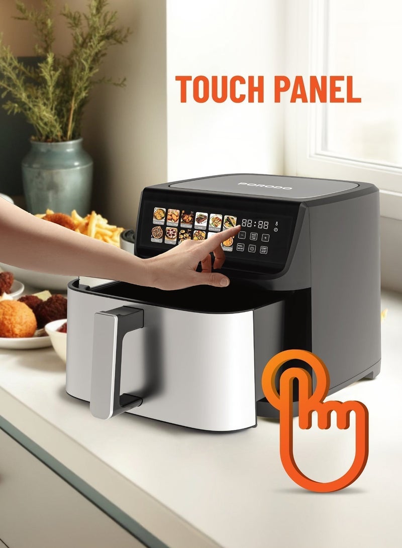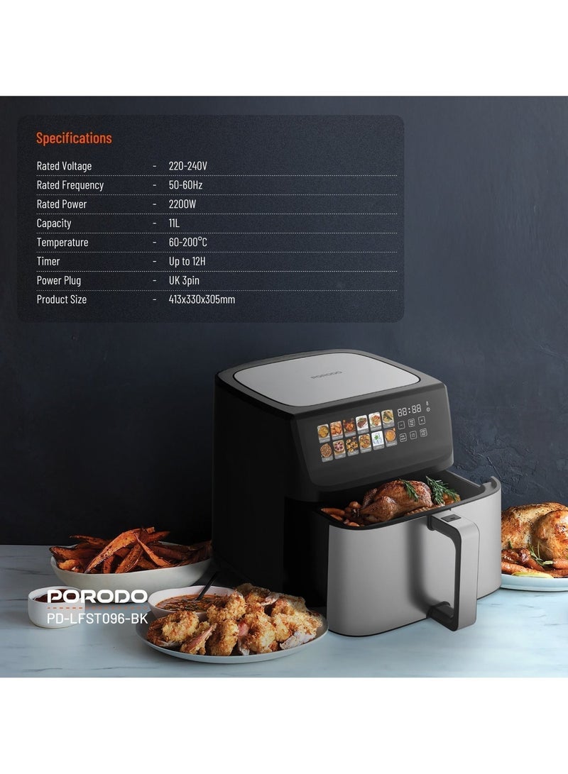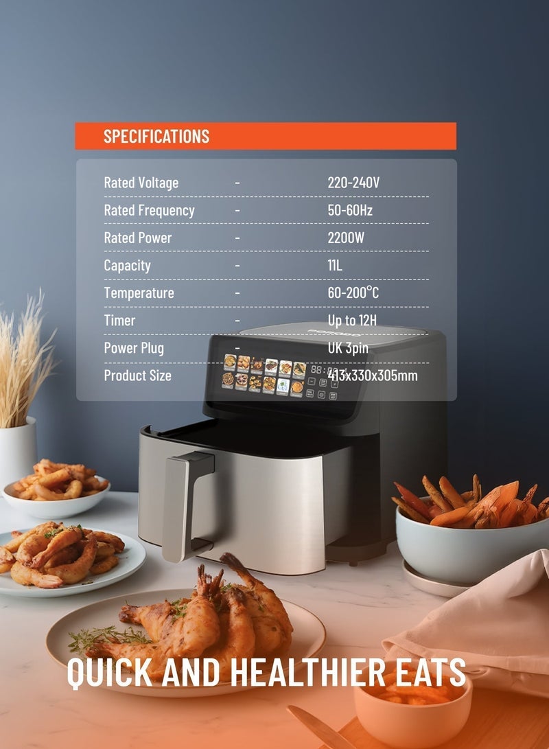 This air fryer has a generous capacity of 11L, making it ideal for preparing large meals for families or gatherings. The touch panel allows for intuitive control and customization, with 12 preset cooking options for various types of food. It operates within a temperature range of 60-200°C, offering flexibility for a variety of cooking methods. The timer can be set for up to 12 hours, giving you full control over the cooking process. With a rated power of 2200W and a UK 3-pin power plug, this air fryer is both powerful and convenient for everyday use. Its compact size of 413x330x305mm fits easily into most kitchens while still providing ample cooking space for your culinary needs.