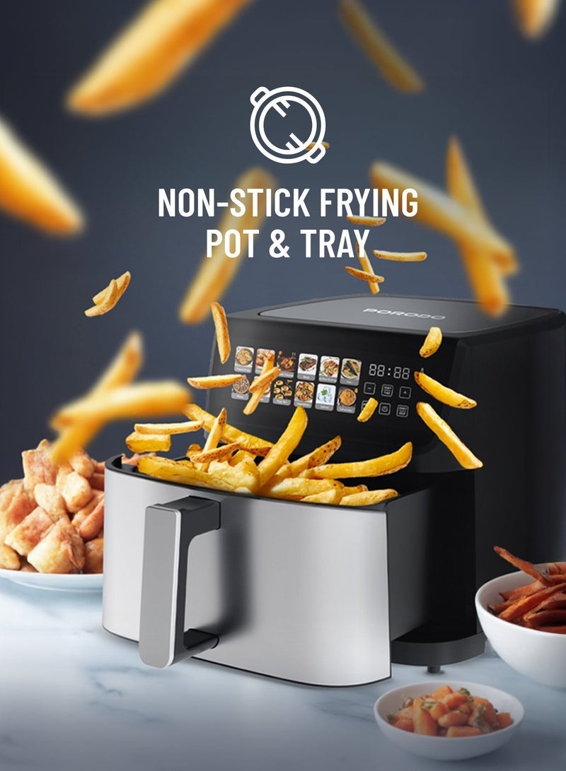 The Porodo Lifestyle Large Capacity 2200W Air Fryer 11L is designed to deliver an exceptional cooking experience with its advanced features. It utilizes dual heating technology, where both the upper and lower heating elements work together for even and efficient cooking, giving you perfectly crispy and juicy results every time. The air fryer comes with a built-in automatic shut-off function, providing added safety and peace of mind when cooking unattended. Its non-stick pot and tray make food release easy and cleaning hassle-free after each use.
