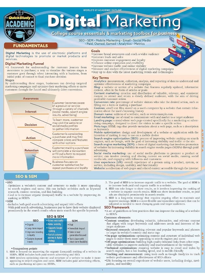 | Book Description | Essential reference and test prep for students in the digital marketing college course, and a great tool for business professionals. This handy six page laminated reference is perfect for those in marketing and a must-have for those who are not but need to understand the concepts, terms, and principles of digital marketing for communication in and across teams for business planning and development. Author, professor and business consultant Dr. Kyle Allison uses his multi-faceted knowledge and experience from teaching and consulting to give you succinct need-to-know facts in our famous QuickStudy format that offers more answers per page than any other source. Color coded sections bulleted for easy access were developed to see the whole scope of how the details fit together for a price that cannot be beat for the knowledge gained. Adopt this tool for your students, or add it to your business team toolbox. 6 page laminated guide includes: Digital Marketing Funnel Goals & Key Terms SEO Framework SEM Framework Step-by-Step SEM Bidding Process Mobile Marketing SMS Marketing Framework Mobile App Marketing Framework Mobile Web & Responsive Design Framework Email Marketing Best Practices Benefits Challenges Types Social Media Marketing Best Practices Benefits Challenges Types Influencer Marketing Best Practices Digital Media Types Paid Media Owned Media Earned Media Digital Marketing Analytics & Metrics Analytics Framework Digital Marketing Datatypes Digital Marketing Metrics |