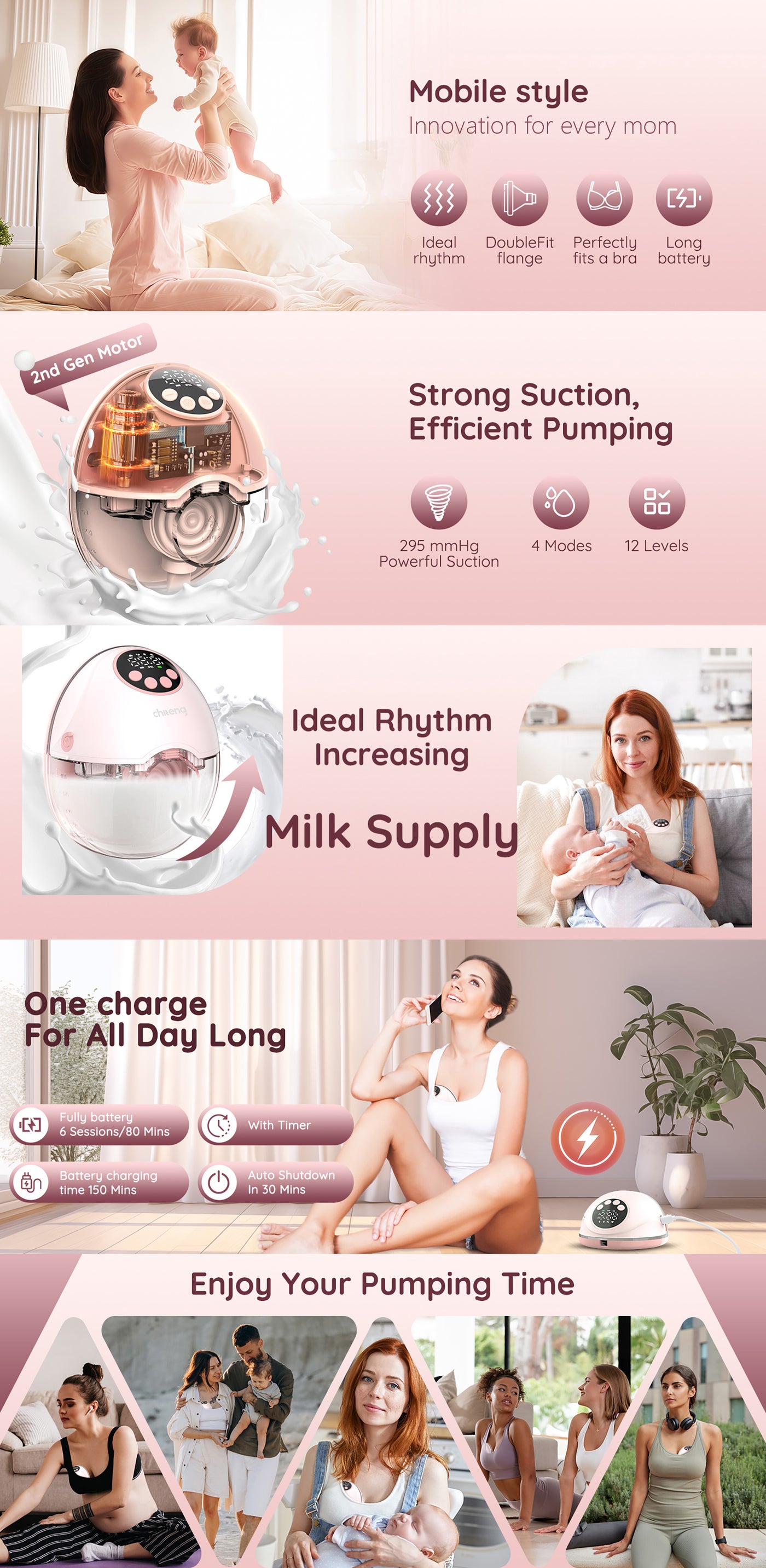 This smart breast pump offers 4 modes and 12 intensity levels, using micro-vibrations to mimic a baby’s natural suckling and enhance milk flow. Its wearable, cordless design provides up to 2 hours of use, with a smart voice reminder and auto-stop at 160ml. Quiet operation (<48dB) and leak-proof flanges in 3 sizes ensure comfort and convenience anytime.