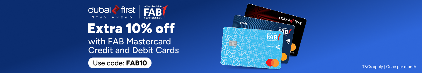 Offer valid for FAB Mastercard Debit and Credit Cards and Dubai First Credit Cards on 1 order from noon using the code FAB10.