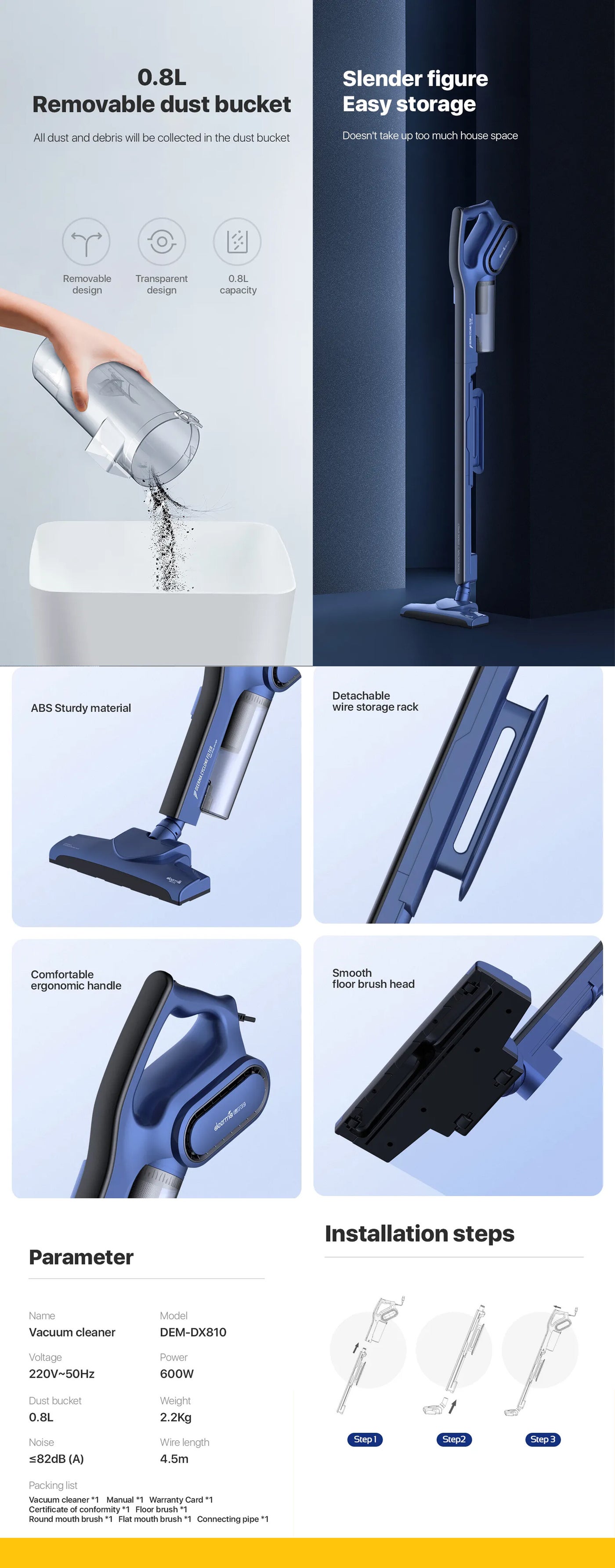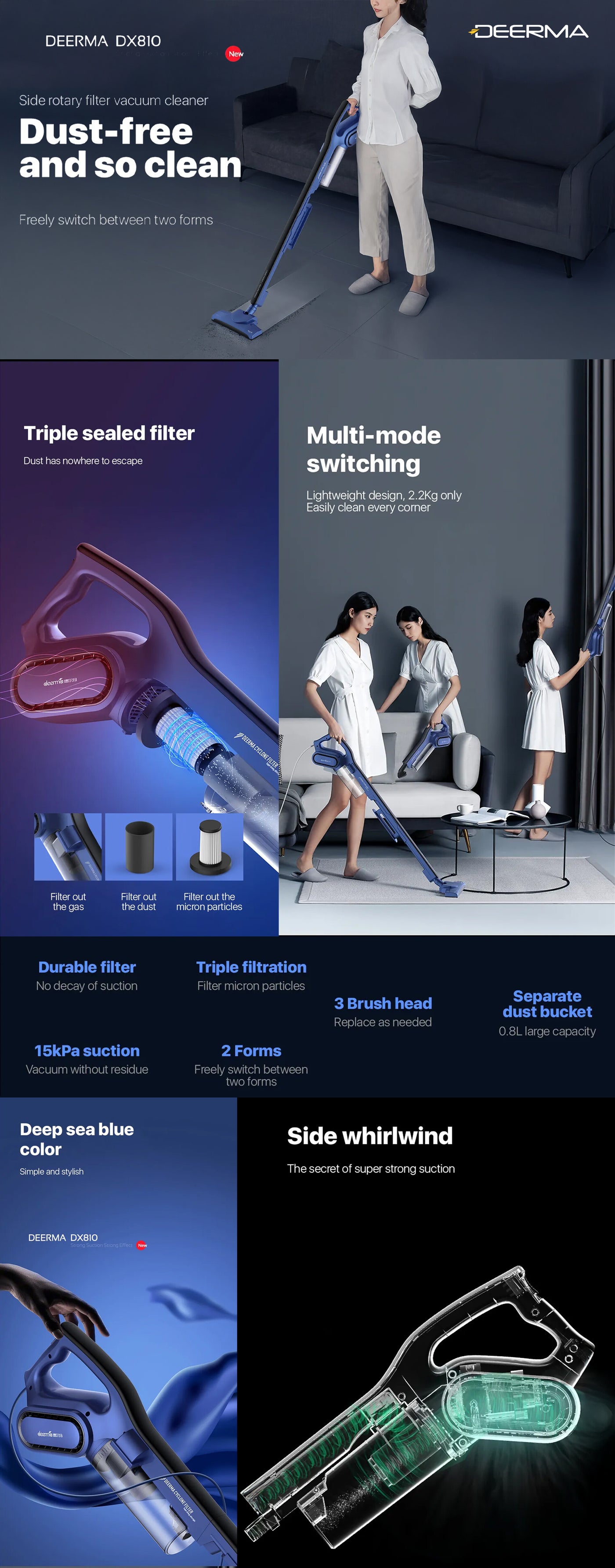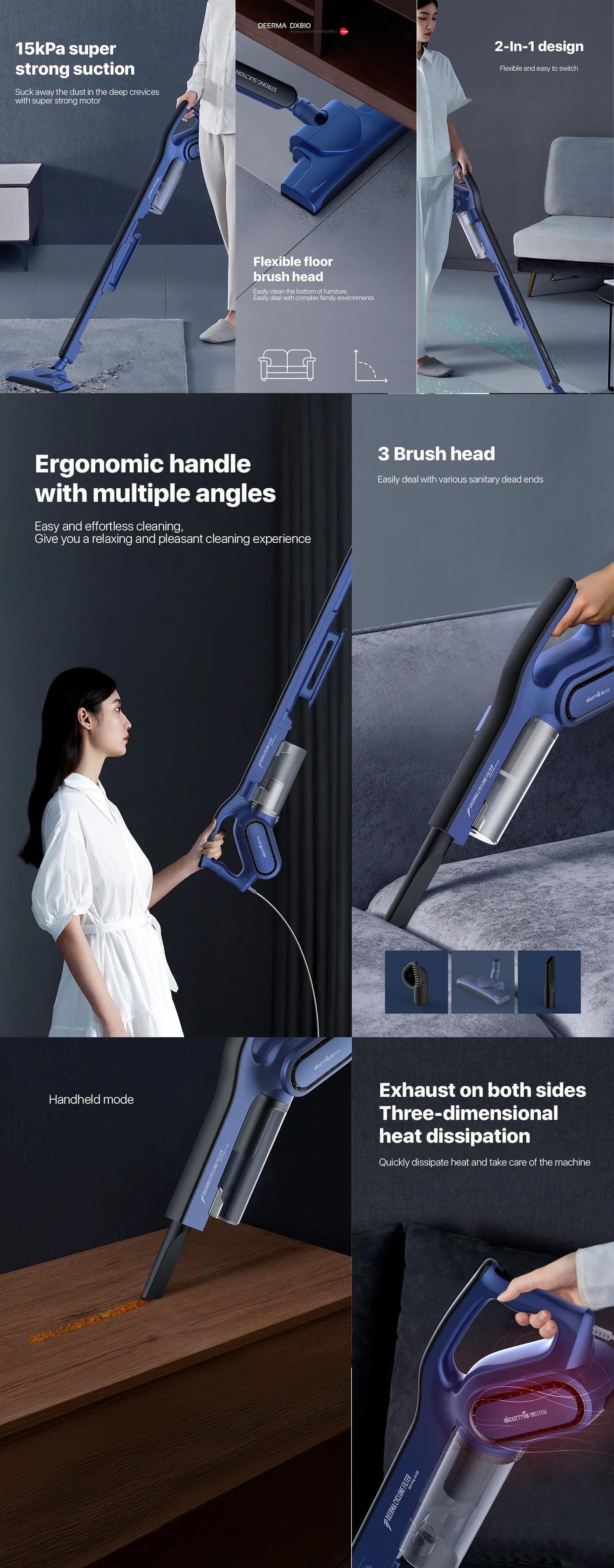 Switch To Dx810 Handheld Vacuum Cleaner To Your Needs As It Serves Dual Purpose, Upright & Hand-Held. Convenient Ergonomic Handle With Sturdy Stainless Steel Is Quite Comfortable For Holding And Suitable For Cleaning On Hardwood, Carpet, Tile Floors, Bed, Sofa And So On.Four-Layer Filtering Does Not Leave Dust In Any Ways. Layered Net Filtration Makes The Discharged Air Cleaner For Breathing. Side Spin Filter, Deeply Absorbs Hidden Dust, Hair, Pollen Keeping Your Home And Office Clean.