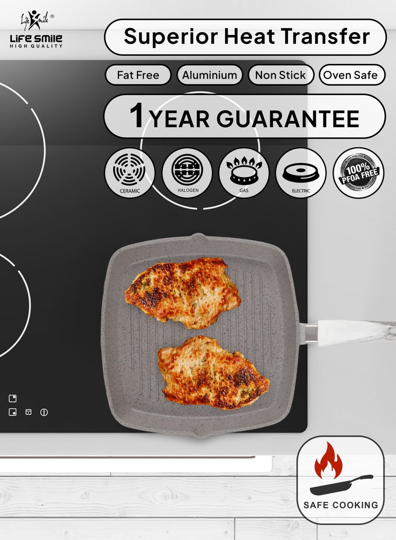 The LIFE SMILE range, crafted from die-cast aluminum with a durable non-stick coating, ensures long-lasting quality and easy cleaning. Ideal for healthy, oil-free cooking, these products require low to medium heat and should not be overheated. Before first use, wash and season with oil or butter. Avoid using aggressive detergents and only hand wash. Compatible with all cooktops, the Bakelite handles and knobs are ovenproof up to 180-240°C. A slight color change in the coating does not affect its performance.