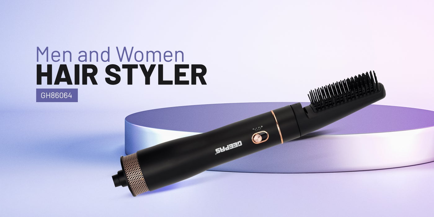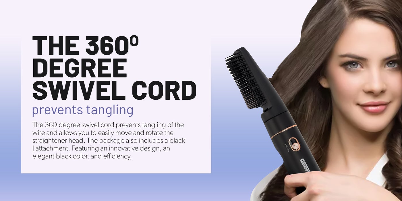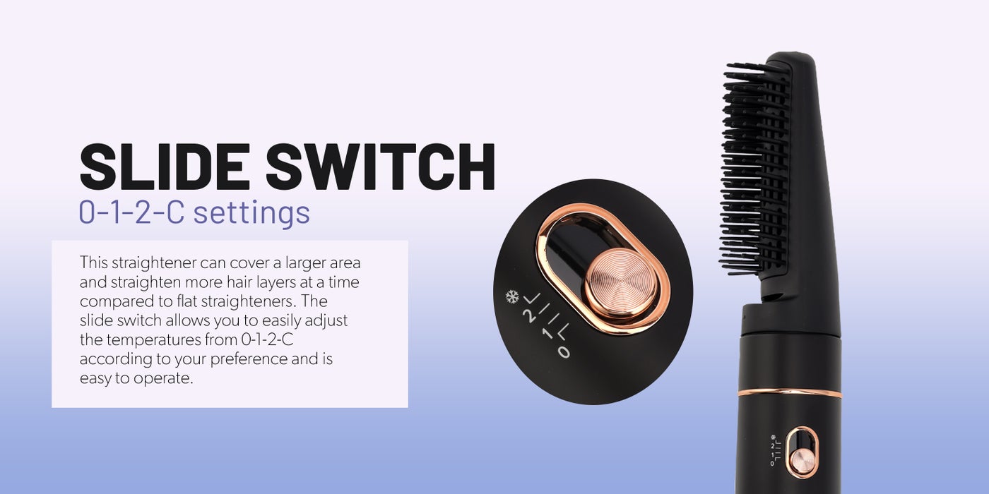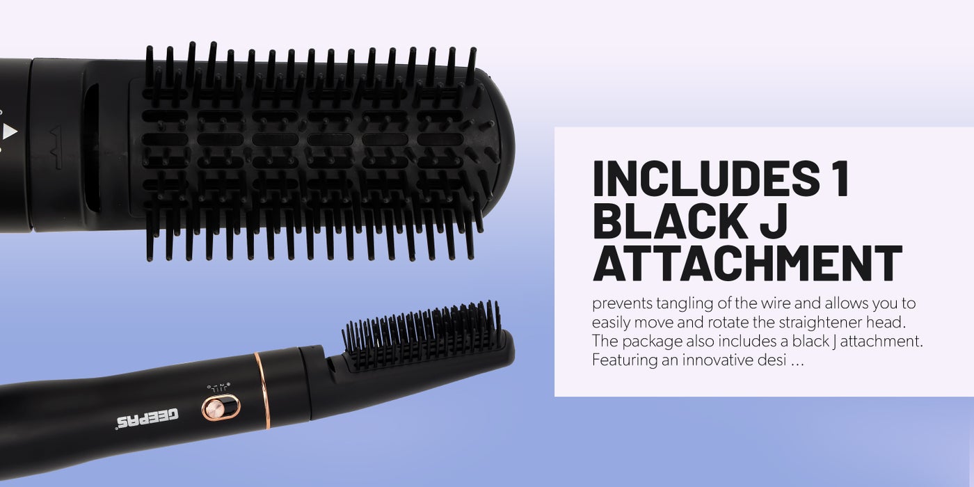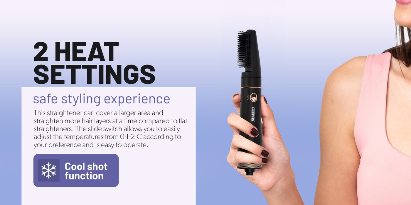With the Geepas hair styler, suitable for men and women, you can be your own professional hair stylist. With this excellent straightener, you can create different hairstyles at your convenience and make a stylish impression. The straightener has a built-in comb, a cooling function, and two heating functions. Innovatively designed, the styler prevents your hair from getting tangled in the straightener, resulting in a smooth and safe styling experience. The built-in comb helps you to reach all the areas from the scalp to the end of the hair with ease. This straightener can cover a larger area and straighten more hair layers at a time compared to flat straighteners. The slide switch allows you to easily adjust the temperatures from 0-1-2-C according to your preference and is easy to operate. The 360-degree swivel cord prevents tangling of the wire and allows you to easily move and rotate the straightener head. The package also includes a black J attachment. Featuring an innovative design, an elegant black color, and efficiency, it will make a thoughtful gift for loved ones.