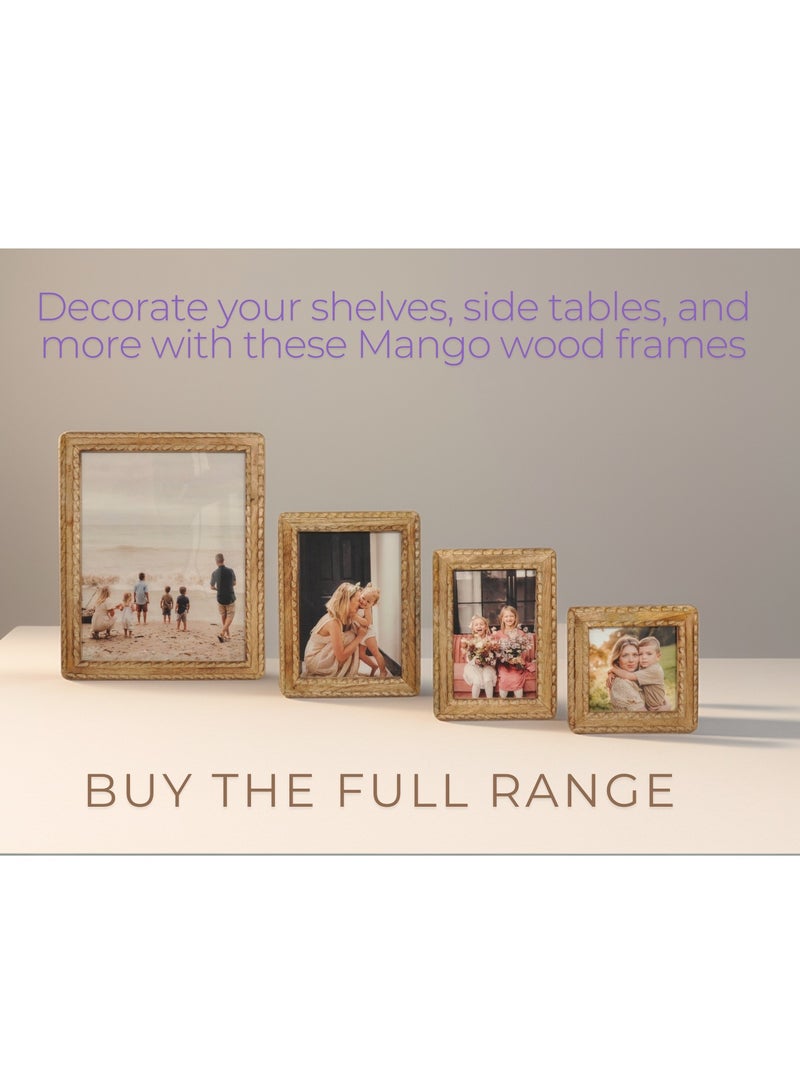 Frame your most important moments with this handcrafted mango wood photo frame. Thanks to its manufacture in mango wood, a very resistant, sustainable and 100% ecological material, and its design of simplicity with its aged color, you will be able to give a natural and vintage air to your rooms. It has a glass to protect the photograph and is perfect for 20x25 cm images. The frame is good to decorate your tables, shelves and bedsides. Mango wood can have a wide variety of shades due to its characteristics. We can find everything from brown or gold tones, through yellow and red, and you can even find darker parts with gray or black tones. This range of colors is part of the natural beauty of this type of wood and makes each piece unique.