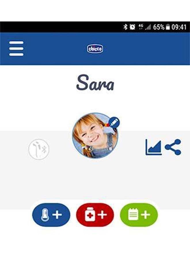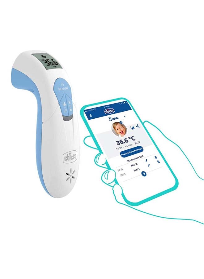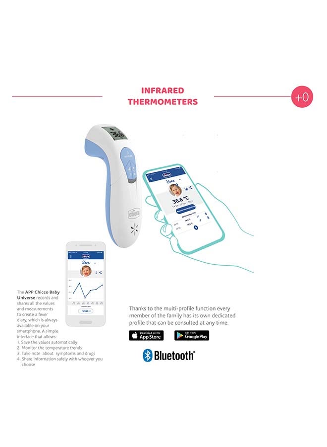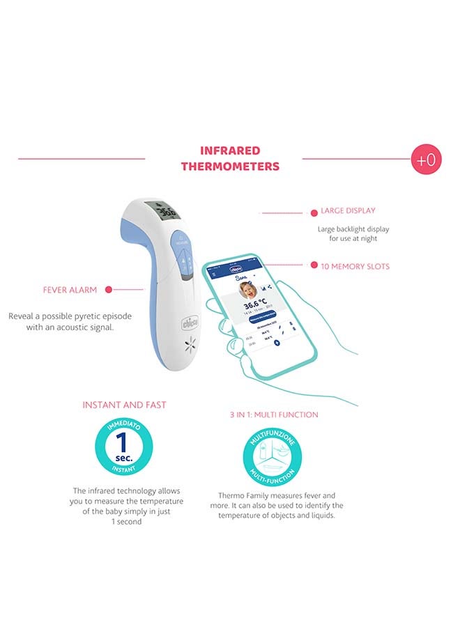 Thermo Family is an infrared thermometer ideal for measuring the foreheads temperature. Measure of the baby and can be synchronized with the smartphone or can be used as a normal thermometer. Thanks to the dedicated App Chicco Baby Universe you can monitor the fever, view data, save and share them safely with whoever you choose.