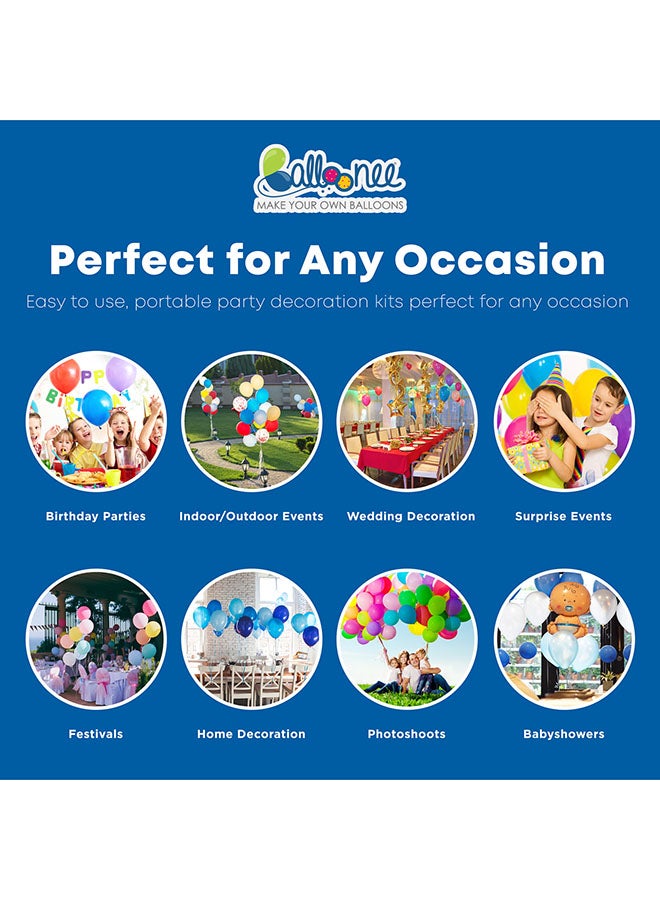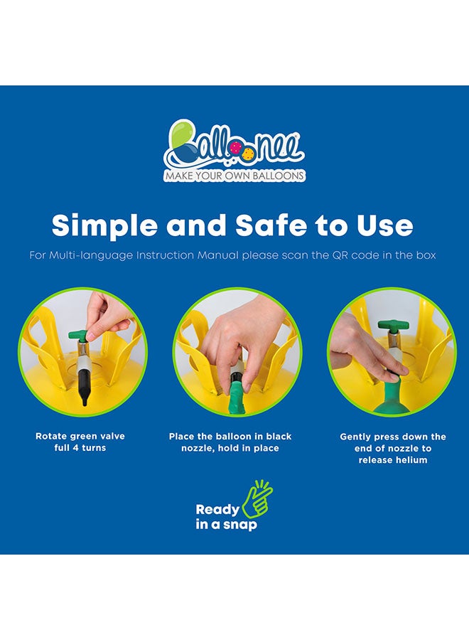 Balloonee Kit contains everything you need to make fun, floating party balloons. This portable, lightweight tank with 14.9 ft3 of helium is perfect for balloons to customize your celebrations. The easy-to-use tank inflates up to 50, 9" latex balloons; 27, 11" latex balloons; or 27, 18" foil/Mylar balloons.