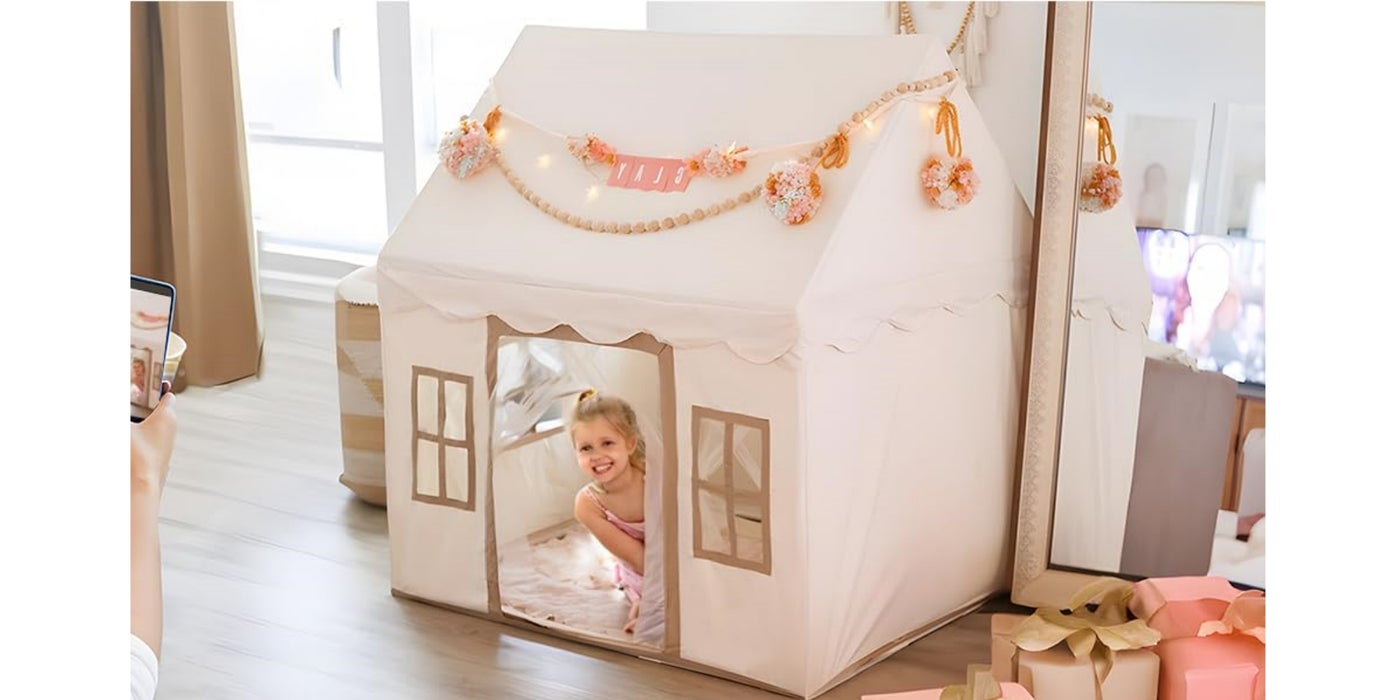 This tent has a door and three windows with curtains, so boys and girls can have their own private place for entertainment, reading and enjoyment.