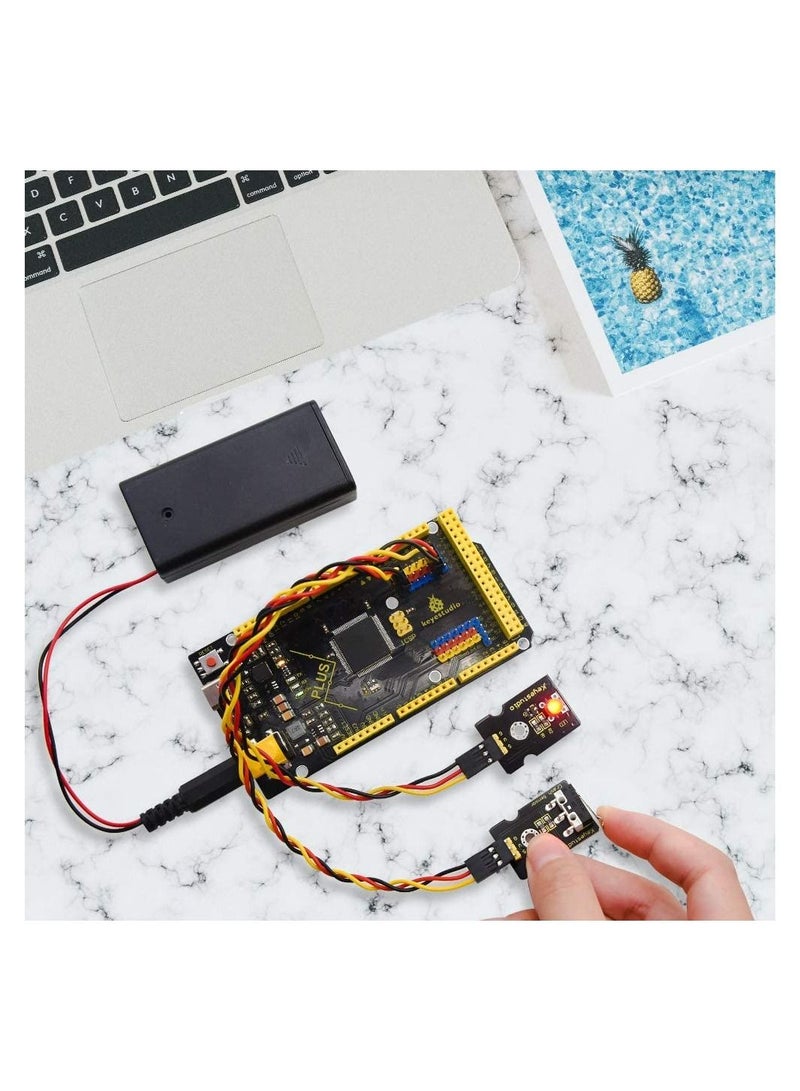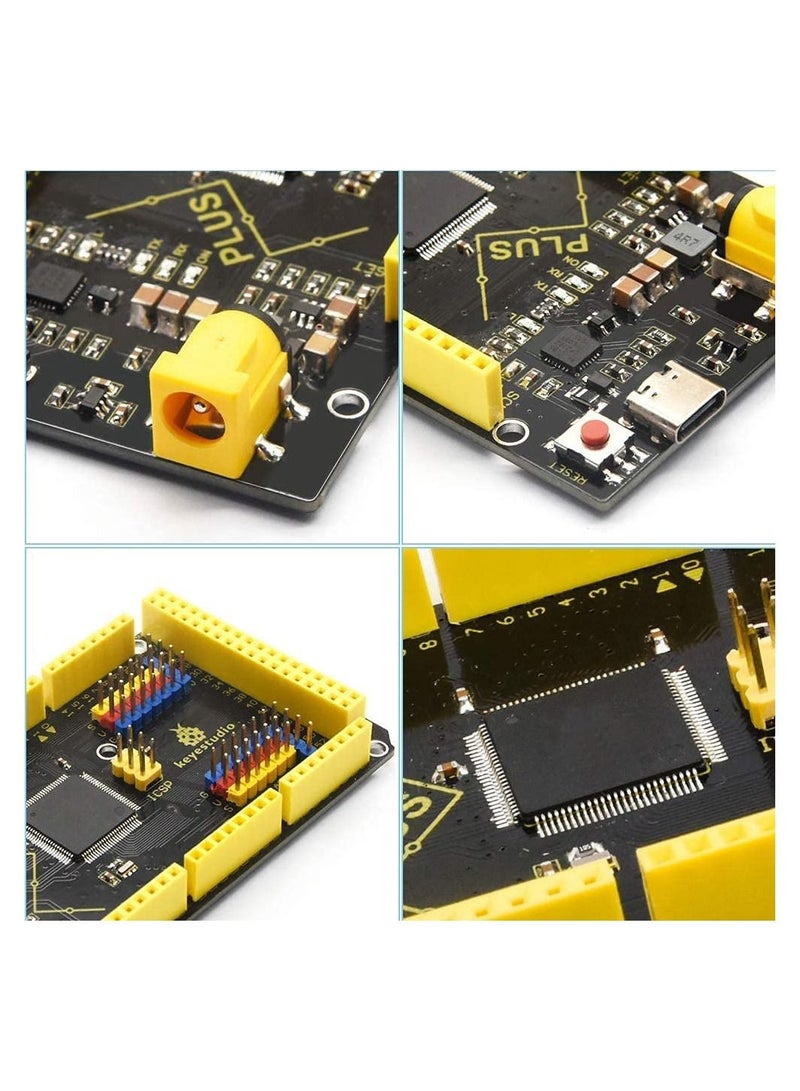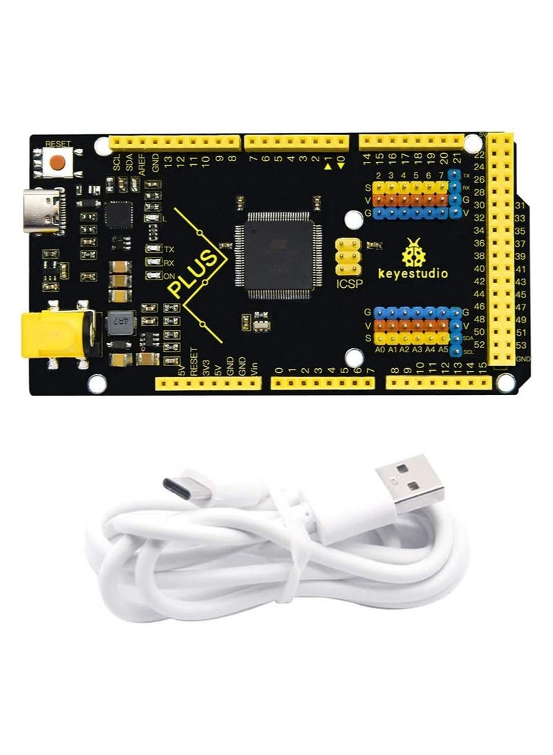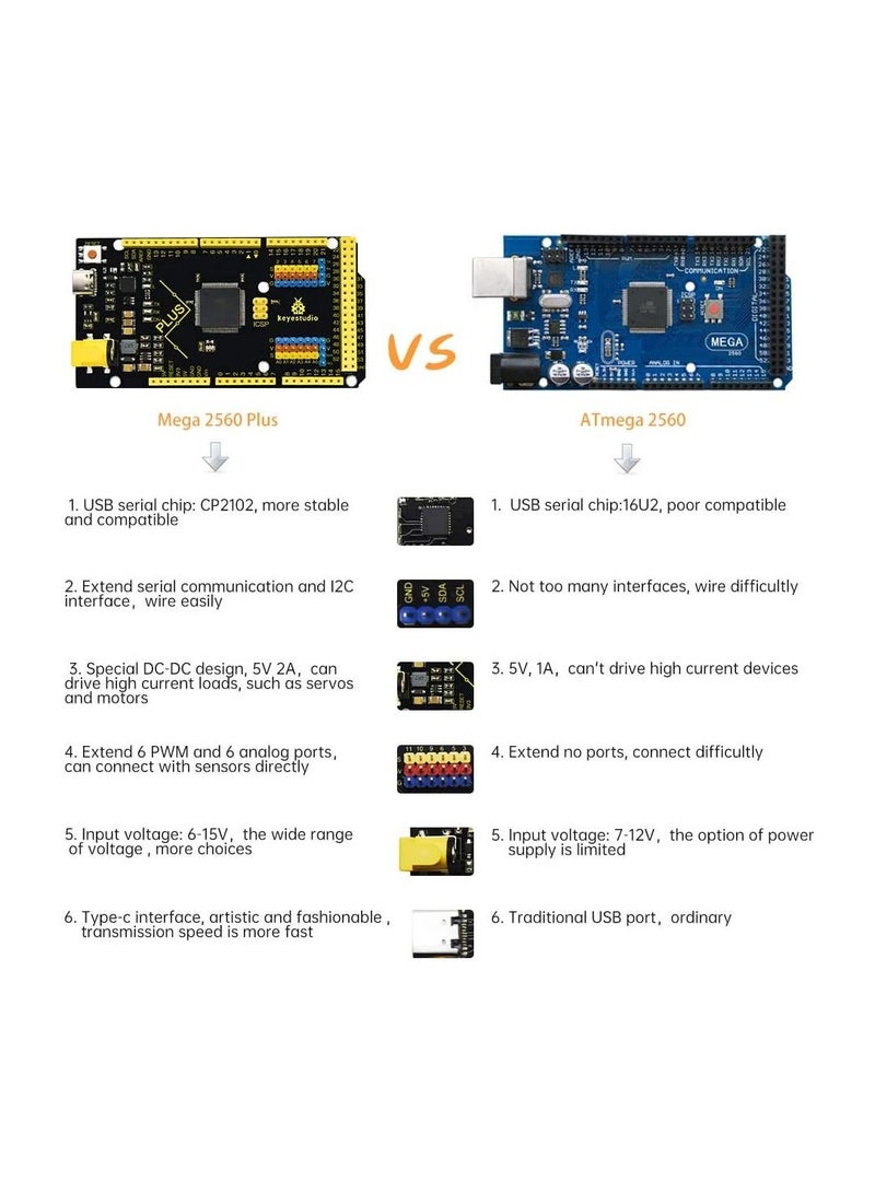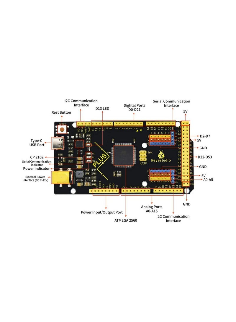 This Microcontroller chip is CP2102 serial chip, When the MCU board is plugged into the computer, if the computer cannot recognize the USB device, please install the CP2102 serial chip driver. Open the device manager of the computer, and you will see a yellow exclamation mark, which means that the CP2102 driver has not been installed successfully. The USB-to--Serial chip of this board is stable and compatible CP2102; USB connector of it is Type C USB Port; Up to 5V, 2A output, can drive drive high-current devices like servo and motor. Additional SPI communication interface, IIC communication interface, Serial communication interface(4 channel); Serial2 (D17 is RX2, D16 equals to TX2), Serial3 (D15 is RX3, D14 is TX3), D0 and D1 are connected to ATMEGA16U2-MU; External interrupt pins The yellow text on black board makes identifying pinsets a breeze. FCC and CE is available. How to get the English manual?You can search for KS0499 on Google, Before buying, you can read the English manual.
