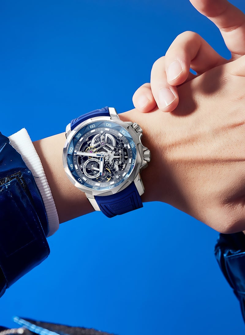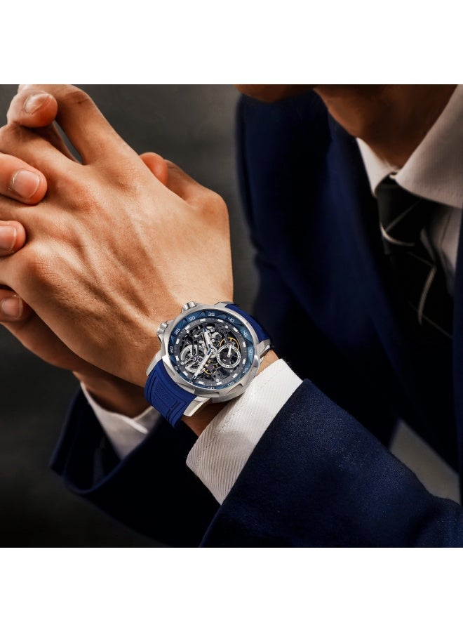 This men's automatic skeleton watch features a modern openwork design with precise automatic movement and an 80-hour power reserve. Designed with a luminous dial for better visibility, it also supports dual time zones through a functional rotating bezel. Made of 316L titanium steel and paired with a green silicone strap, it offers long-lasting durability and comfortable wear for everyday use.