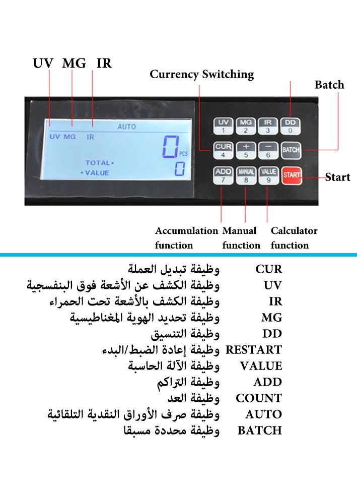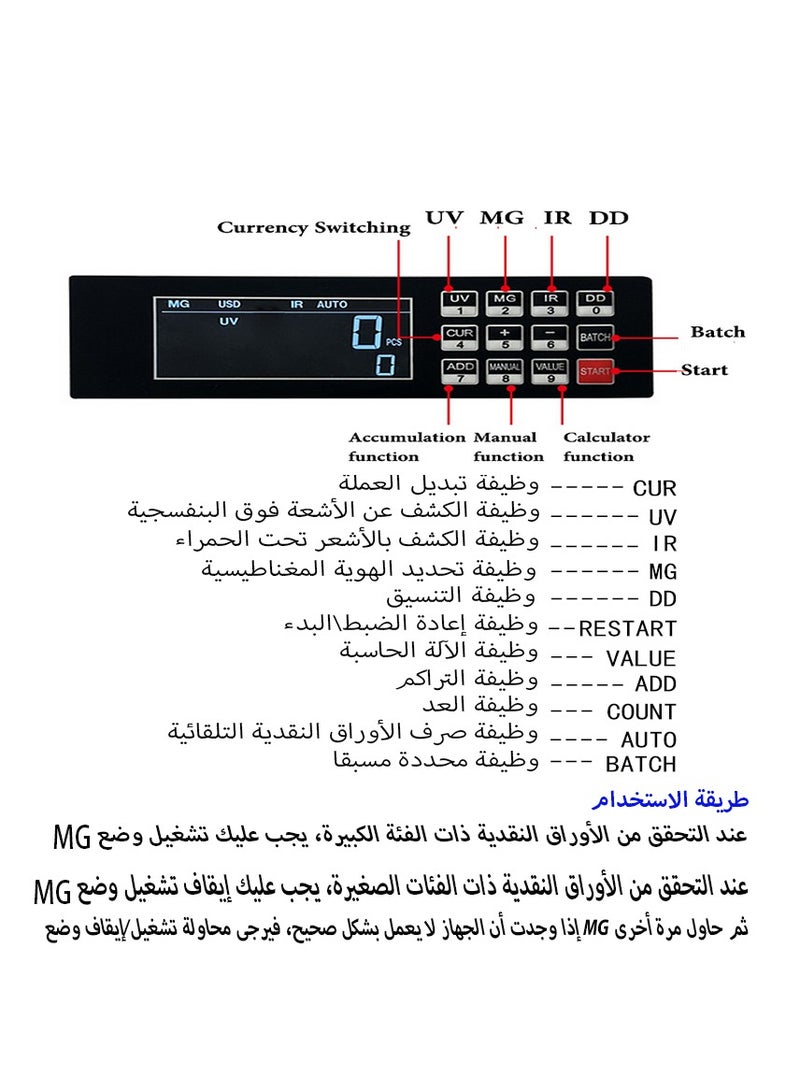 Efficient Operation: With a counting speed of 900 notes per minute, this machine ensures quick and efficient cash handling.12 keys provide a full set of numeric keypad and 11 functions, including automatic, manual, batch, addition, value, currency, setting, UV, IR, DD, MG. The number keys allow you not only to count a fixed number of notes in the batch function, but also to freely set the number of notes to be counted