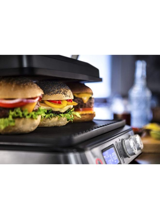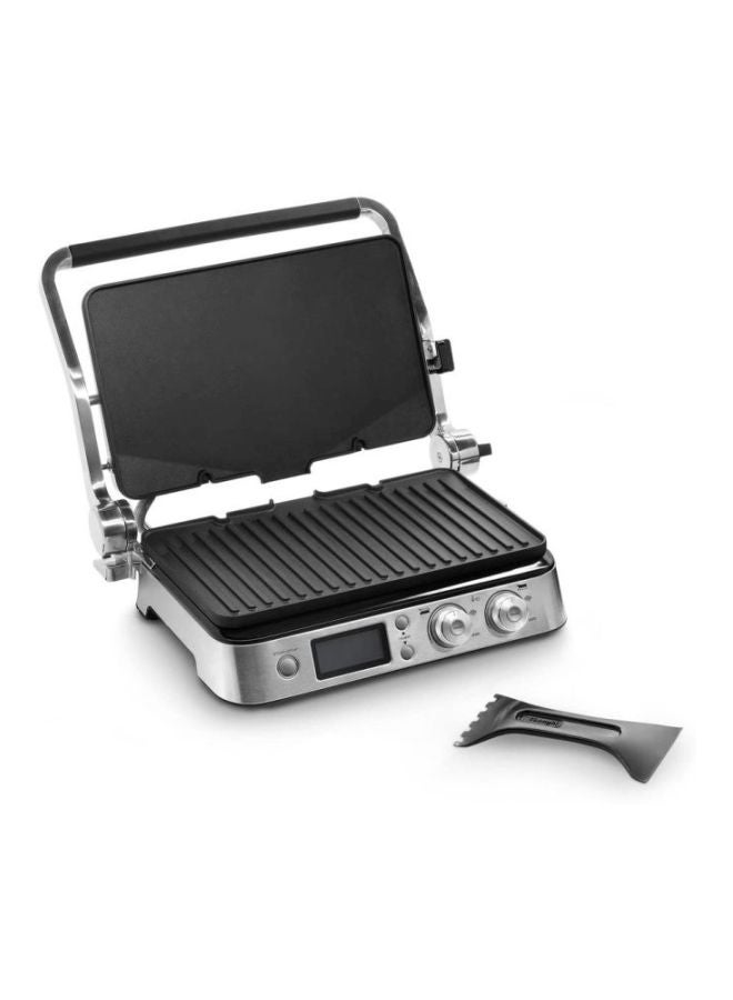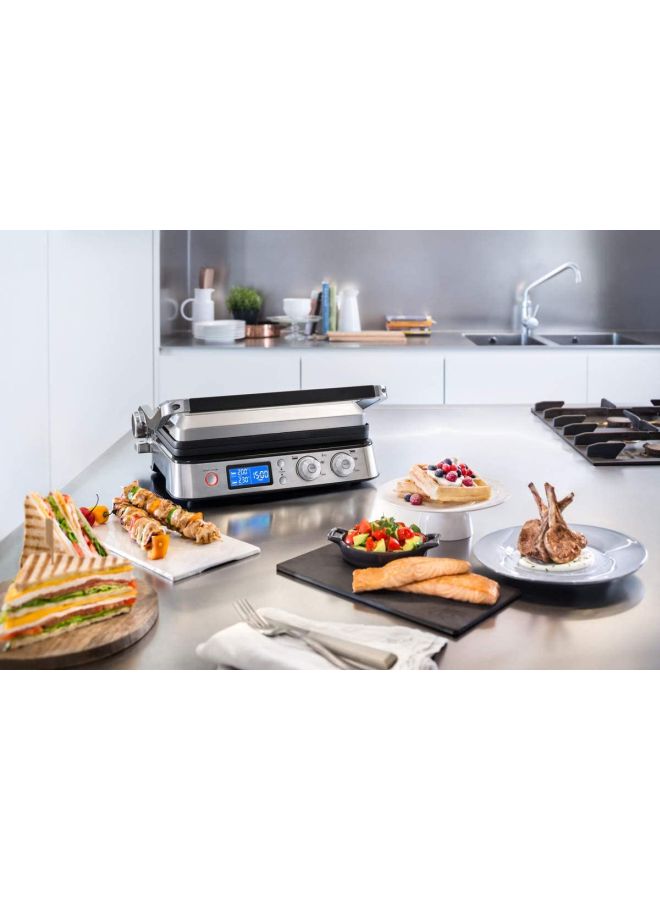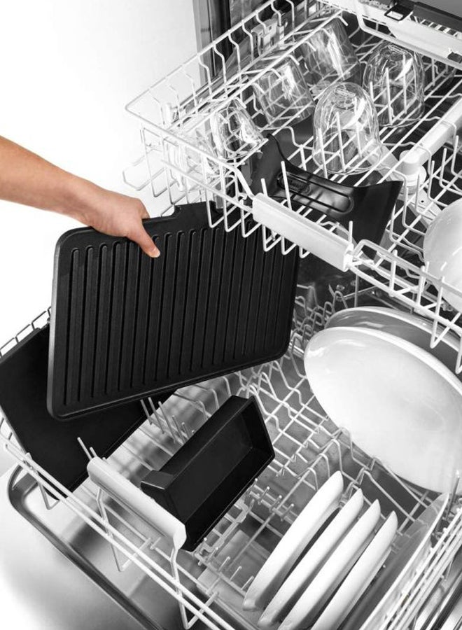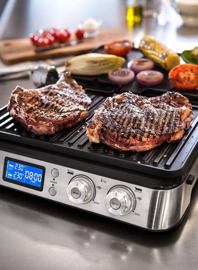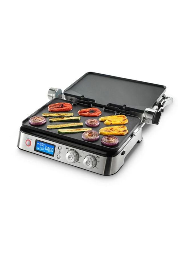 3 in 1, Contact Grill and Open BBQ for delicious meals and sandwiches electronic temperature control and digital control panel; Sear function to keep your meat tender and juicy.Included 1 set of large plates - 1 x Grill and 1 x Griddle - in Teflon coating with a total cooking surface of 850 cm² - Extra Grill and Grid or Waffle plates are available to buy separately Easy to clean with fully dishwasher-safe plates.MultiGrill, Contact Grill CGH 1012D. Independent thermostats. Two separate thermostats with two independent knobs on the control panel allow to set and manage the temperature of each plate thus allowing for absolute precision in cooking. Sear Function: The special sear function allows to keep the meat tender and juicy inside by searing it during the early stages of cooking. Dishwasher safe: Both the plate and the grease collector are fully removable and dishwasher-safe for fast and easy cleaning. Specifications: Timer: Integrated Rated voltage/Frequency (V~Hz): 220-240 V / 50-60 Hz. Input power (W): 2000. Plates material: Die-cast Sear function. Removable plates. Reversible plates. Adjustable thermostat. Non-stick surface. Autoshut OFF. Controls: Digital Cooking position: 3 Cool-touch handles. External dimensions (wxdxh) (mm): 458 x 343 x 185. Heating element: Embedded indicator light. On/off switch. Plates dimensions (wxd) (cm): 370x230. Safety micro switch. Set of plates: Grill plate and griddle plate. Drip tray: integrated spatula. Storage lock system. Independent control of the plate's temperatures.