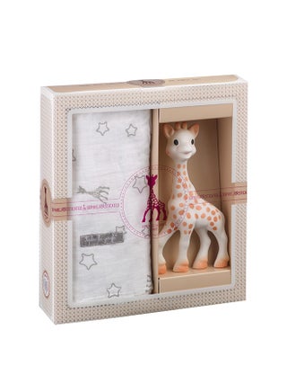 Thanks to this second gift set, it is possible to offer the Sophie la girafe large swaddle providing multiple daily uses and the sweet Sophie la girafe.
