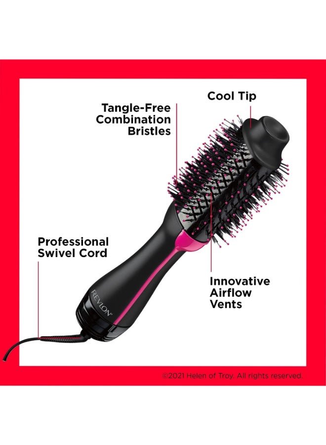 The Revlon One-Step Hair Dryer and Volumizer is a designed hot air brush to deliver gorgeous volume and brilliant shine in a single step. The unique oval brush design smooth hair while the rounded edges quickly create volume at the root and beautifully full-bodied curls at the ends in a single pass, for salon blowouts at home. The brush is designed with Nylon Pin & Tufted Bristles for detangling, improved volume and control. Styling flexibility is guaranteed with 2 Heat/Speed Settings and a Cool Option. Built with 1100 Watt power to provide just the right amount of heat. Unlike conventional hair dryers, this volumizer can be placed closer to the scalp for lift. Boosted by Ionic Technology through a built-in genuine ION generator, hair dries fast and helps reduce heat damage.