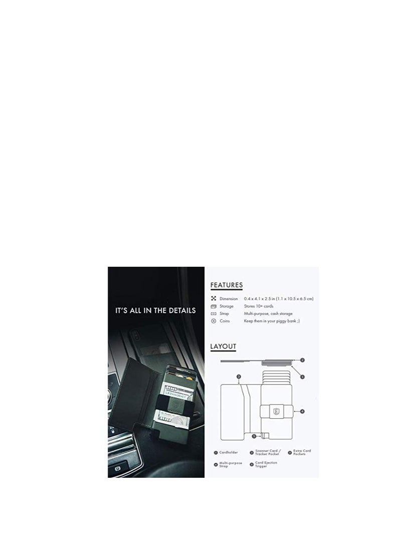 QUICKEST ACCESS – Instant card access at the click of a button. Stores 10+ cards in total and the built-in aluminum cardholder stores 4-6, depending on the number of embossed cards.