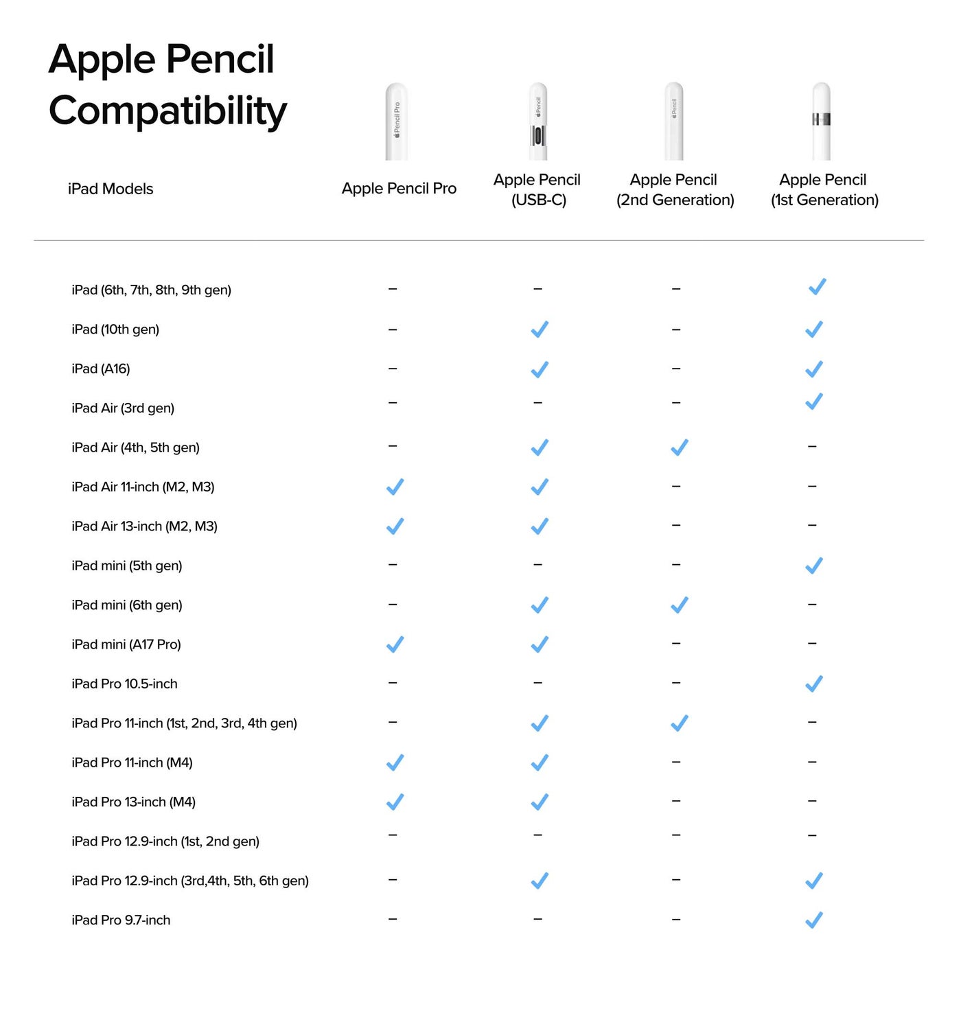 COMPATIBILITY — Apple Pencil Pro works with iPad Pro 13-inch (M4), iPad Pro 11-inch (M4), iPad Air 11-inch (M2 and M3), iPad Air 13-inch (M2 and M3), iPad Air 13-inch (M2), iPad Air 11-inch (M2) and iPad mini (A17 Pro).