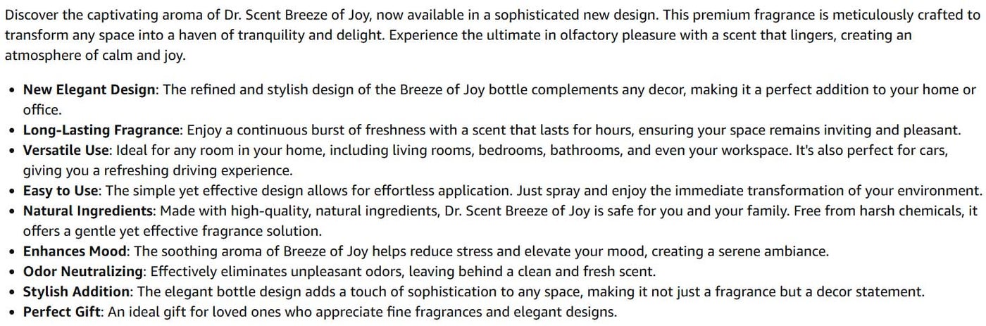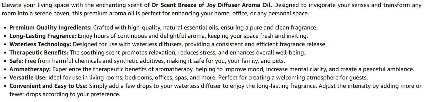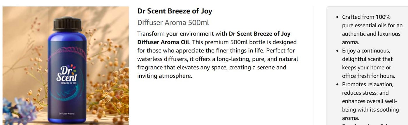 Dr Scent Breeze of Joy Portable Aroma Oil for Car diffusers Oudy is a luxurious fragrance designed to transform your driving experience. This exquisite scent combines the intense, rich notes of premium Agarwood with sweet, irresistible notes of Praline, and strong, woody Clove hints. The compact 10ml bottle ensures a long-lasting fragrance that keeps your car smelling fresh for weeks. Perfect for daily commutes, road trips, or any time you want to enhance your driving experience with a touch of luxury.
