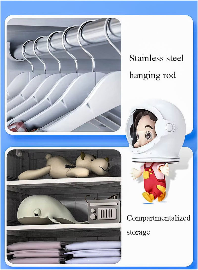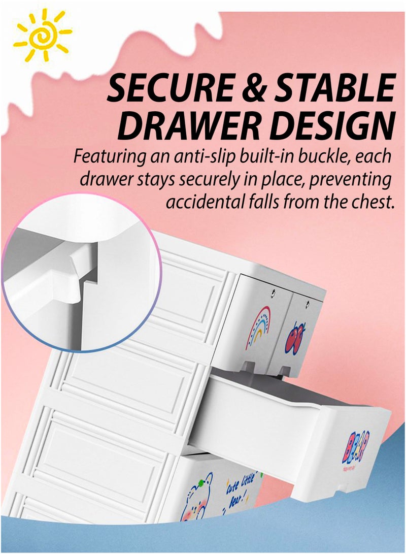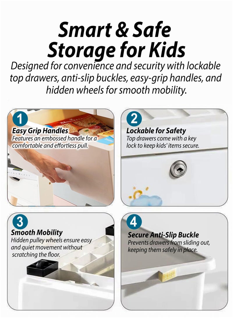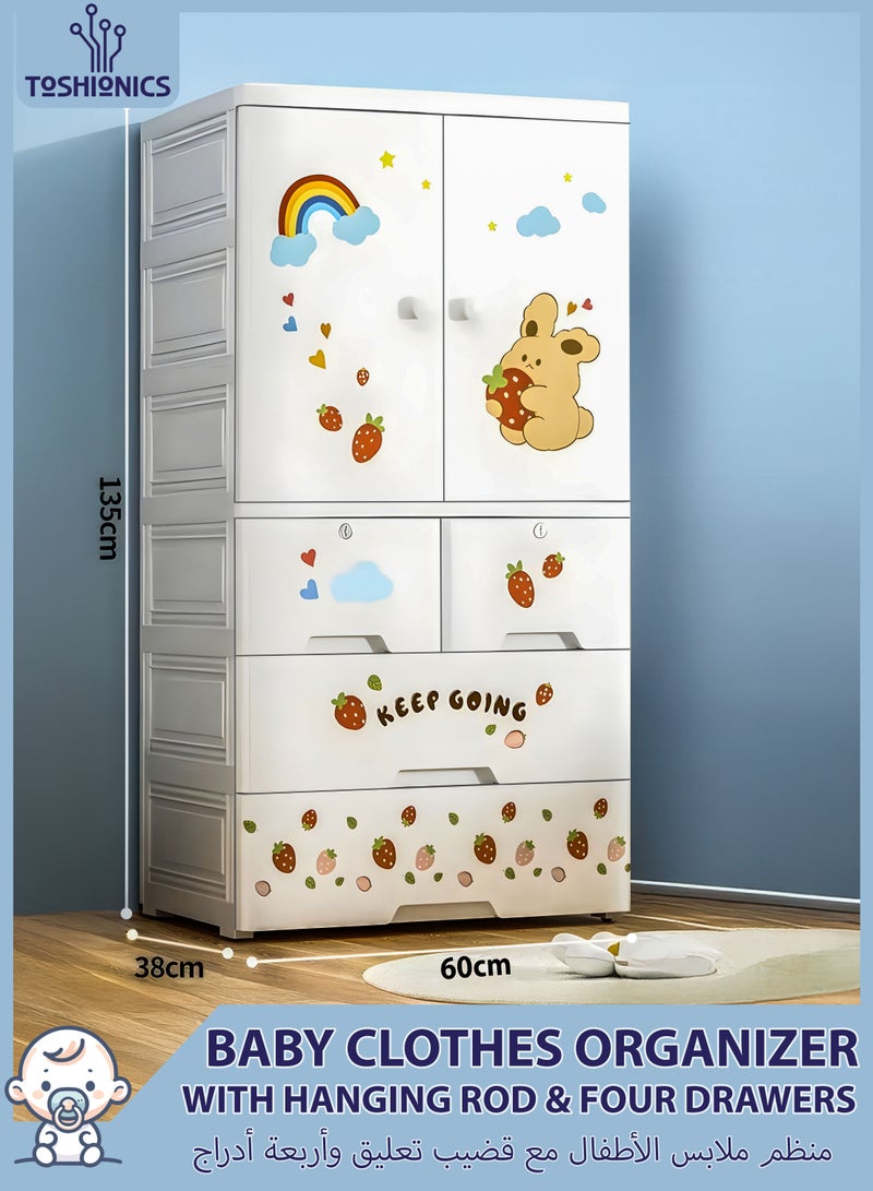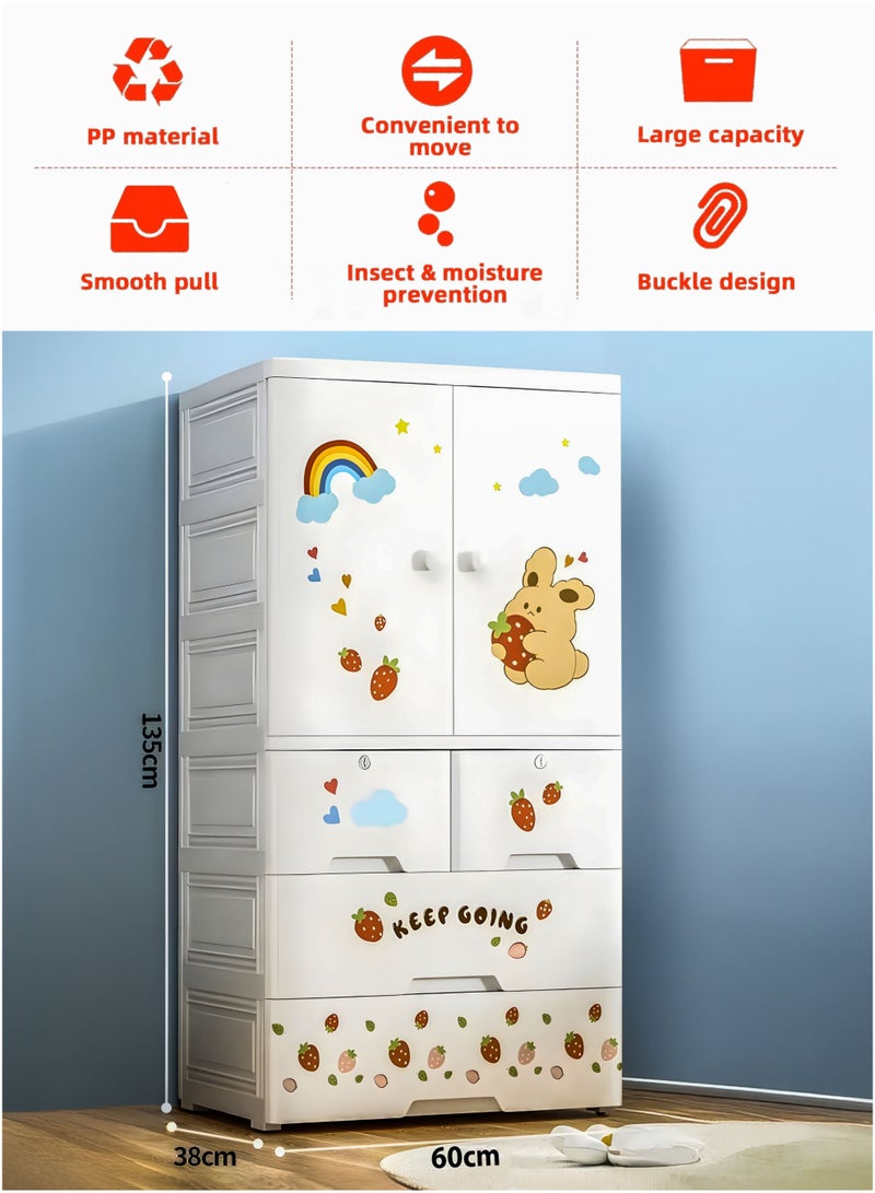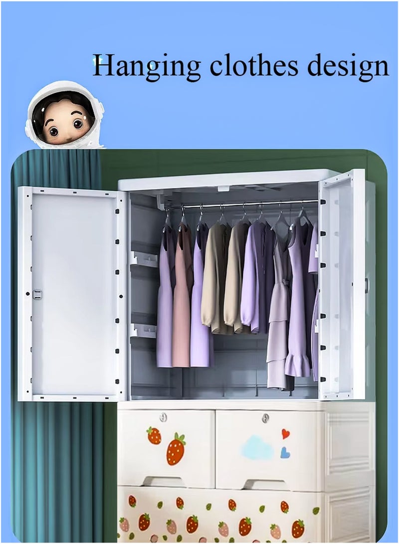 The Thick PP Plastic Storage Organizer is a durable and versatile solution for keeping kids' rooms neat and tidy. With dimensions of 60cm (L) x 135cm (H) x 38cm (W), it features a sturdy top surface for additional storage, a two-door upper compartment with a metal rod for hanging clothes, two lockable middle drawers for securing smaller items, and two spacious bottom drawers for bulkier belongings. Made from child-friendly, waterproof, and easy-to-clean PP plastic, this organizer is designed with rounded edges for safety and equipped with 4 wheels for effortless mobility. Its quick, tool-free assembly and foldable design make it convenient to set up and store away when not in use. Perfect for storing clothes, toys, books, and other daily essentials, this modern and stylish organizer enhances any bedroom or playroom while ensuring long-lasting durability and practicality.