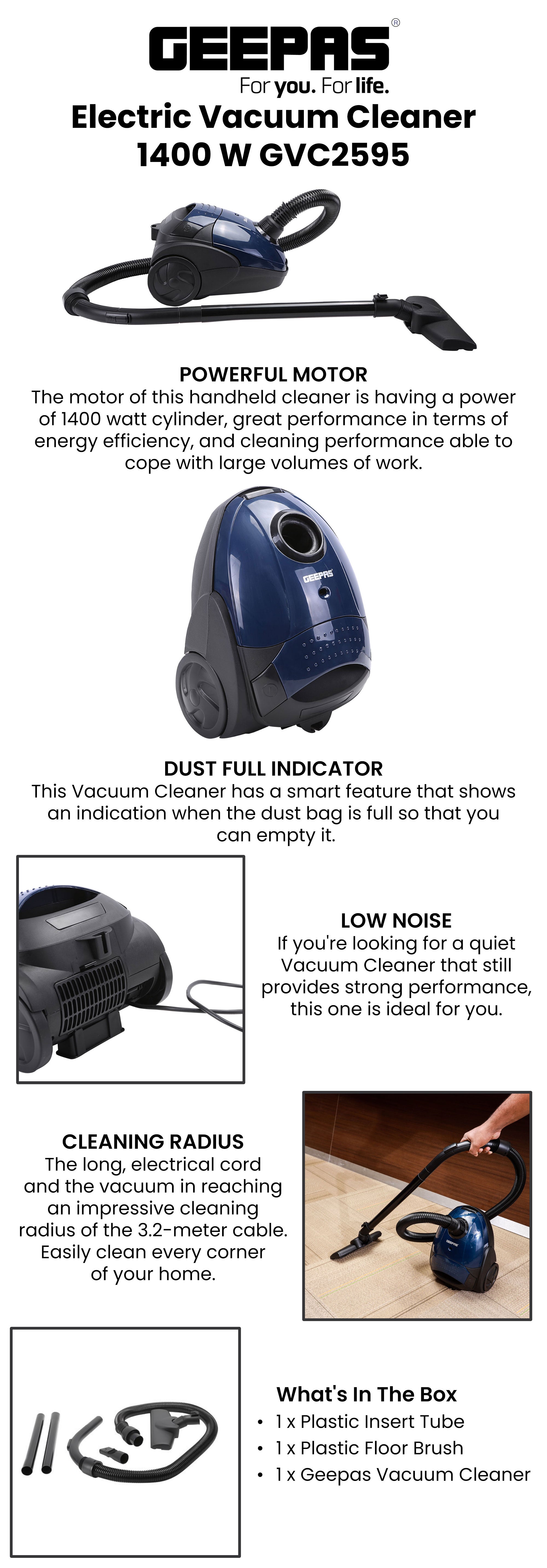| What's In The Box | 1x Plastic Insert Tube, 1x Plastic Floor Brush, 1x Geepas Vacuum Cleaner |
