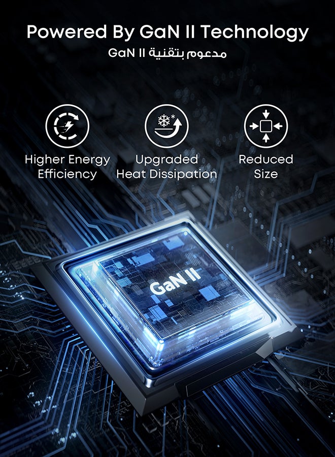 Powered by GaN II Technology: With a 100% increase in operating frequency, an innovative stacked design, and an upgraded circuit board structure, GaN II technology makes our latest charger smaller without sacrificing a drop of power.