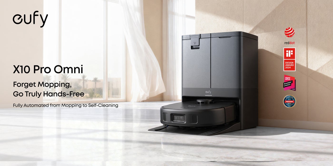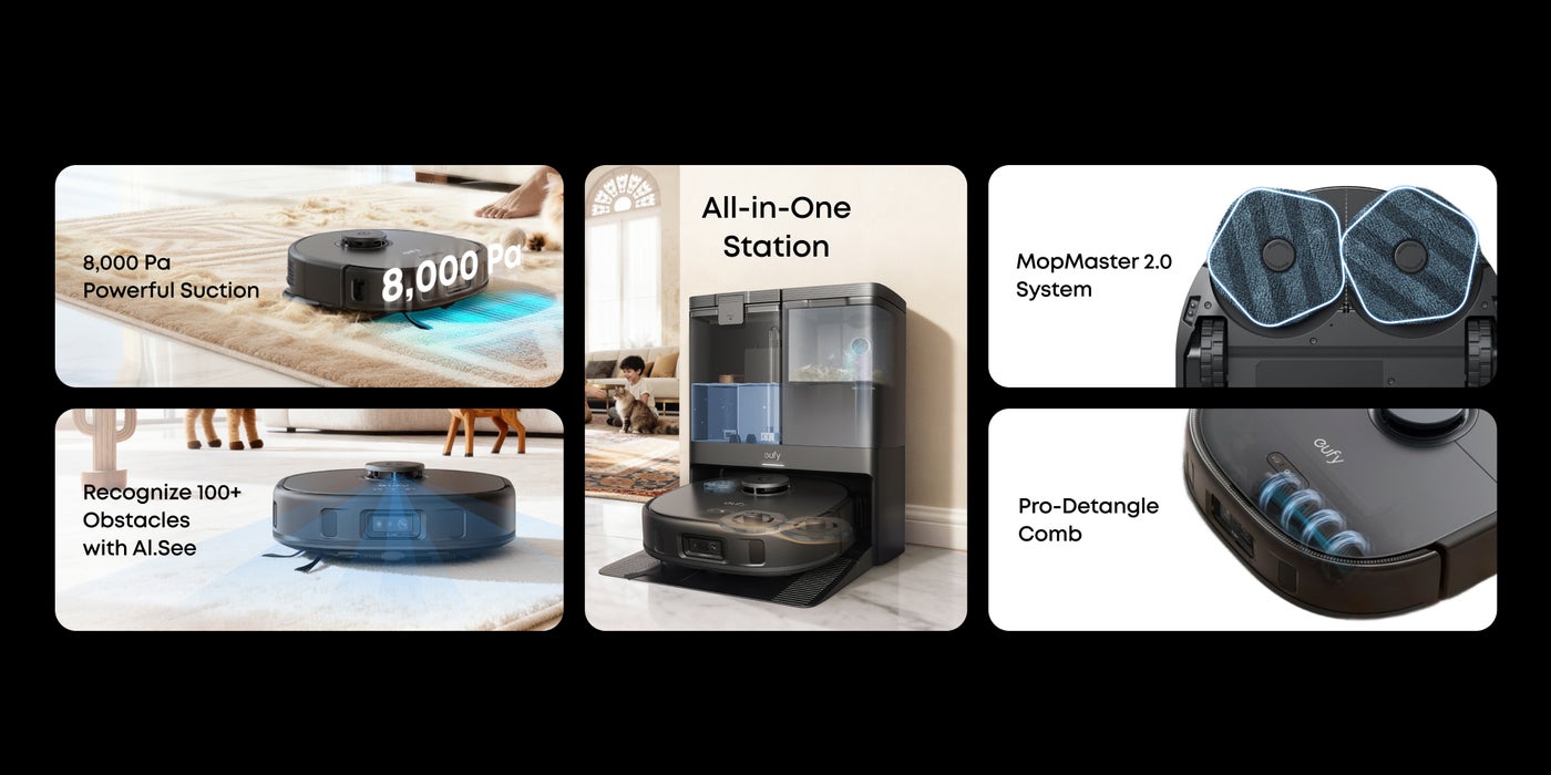 eufy X10 Pro Omni Robot Vacuum and Mop with 8,000 Pa Suction, Dual Mops with 12 mm Auto-Lift and Carpet Detection, AI Obstacle Avoidance, Auto Mop Washing, Self-Drying, Self-Emptying, Self-Refilling 20 W T2351 black
