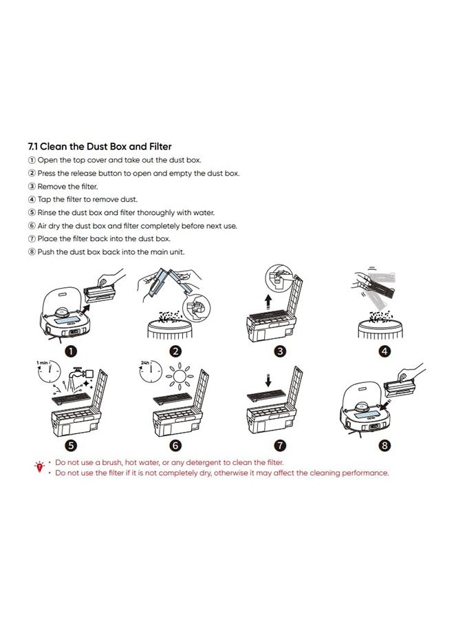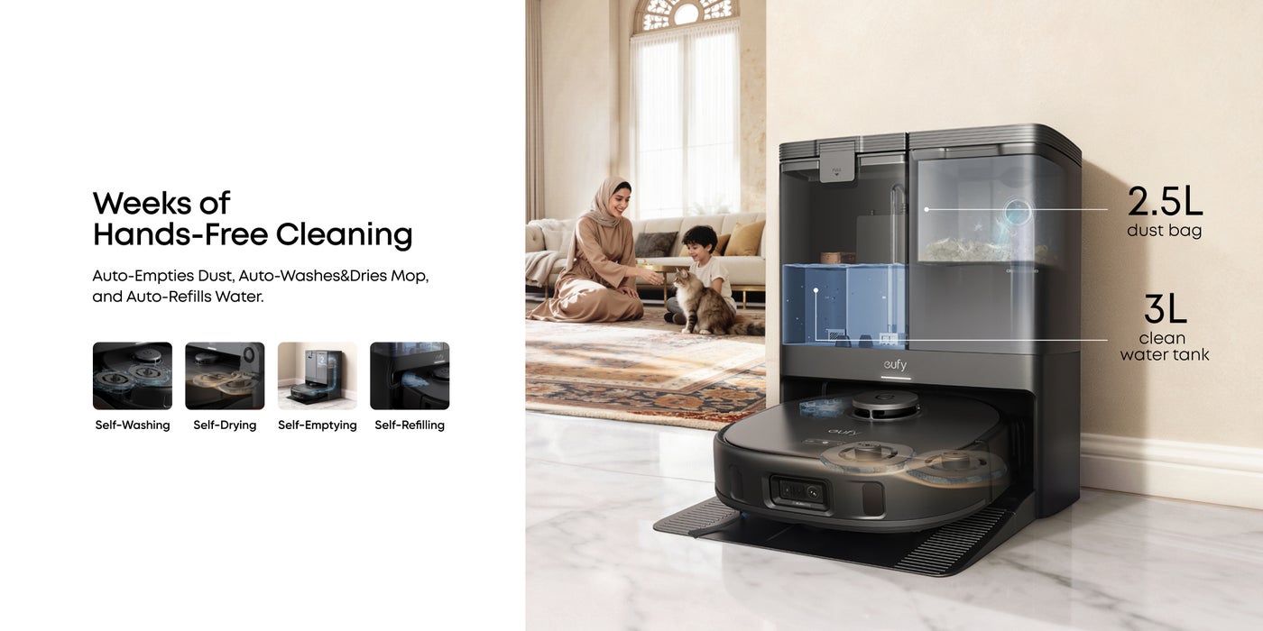 [All-in-One Station for Hands-Free Cleaning]: X10 Pro Omni's mop pads are washed using clean water, then dried with 45°C (113°F) heated air to prevent bad odor and the growth of bacteria. Its dust bin is emptied into the station's 2.5L dust bag, which only needs to be replaced every 2 months. The 3L clean water tank provides enough water to mop a 1,500-2,000 sq ft (150 sq m) home 2-3 times.