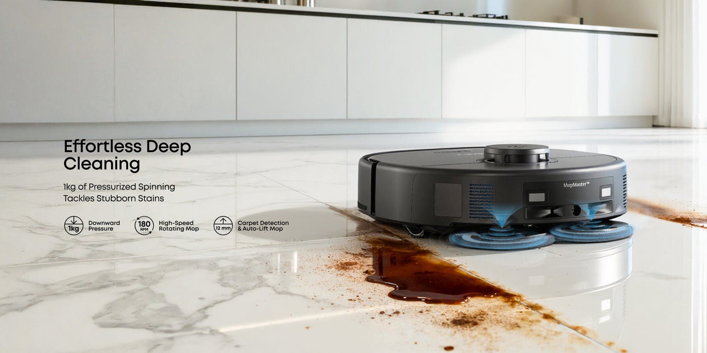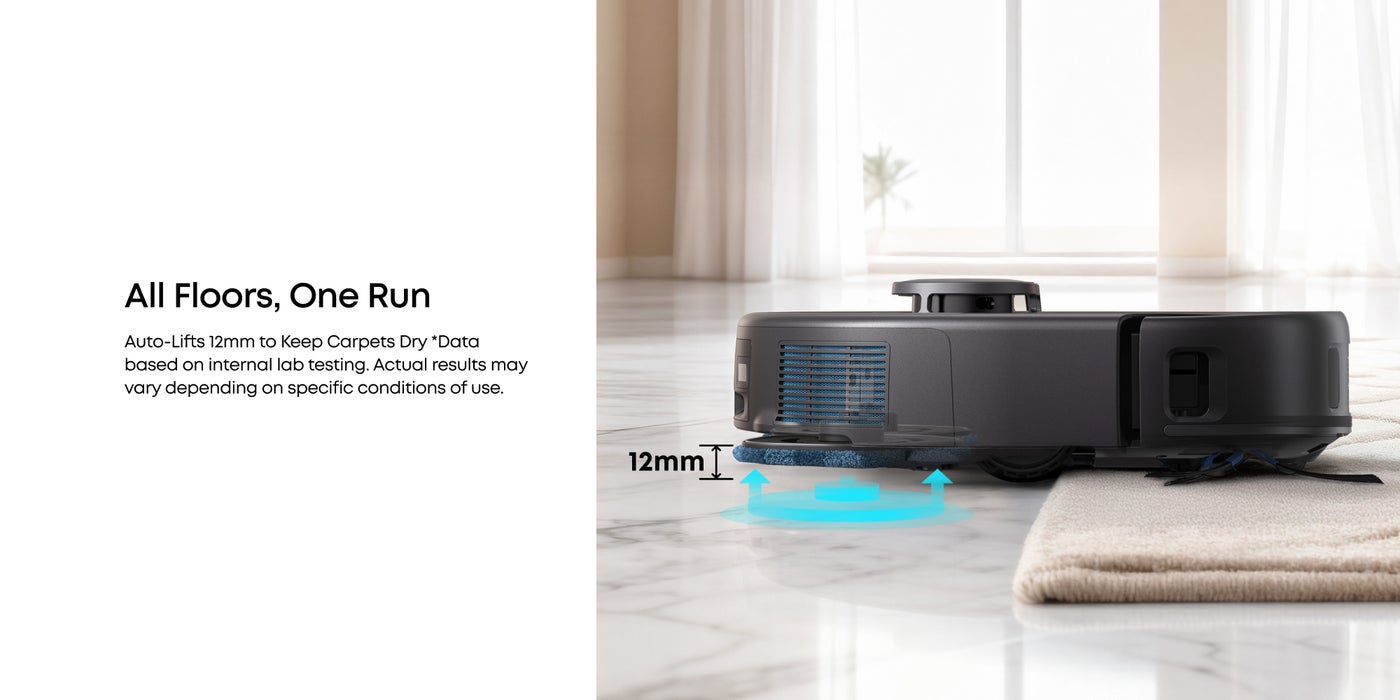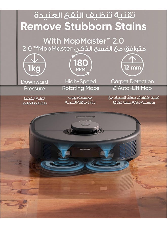 [MopMaster 2.0 for Spotless Floors]: With 180 rotations per minute and 1 kg of downward pressure, X10 Pro Omni's dual mop pads easily eradicate stains and leave you with floors that shine. When a carpet is detected, the mops automatically lift by 12 mm to prevent it getting wet.