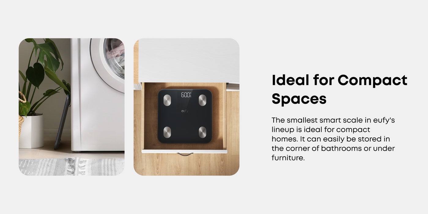 Compact Design: Eufy A1 Smart Scale measures just 26 × 26 × 2.5 cm, making it ideal for small spaces. It can easily be stored underneath furniture for further convenience.
