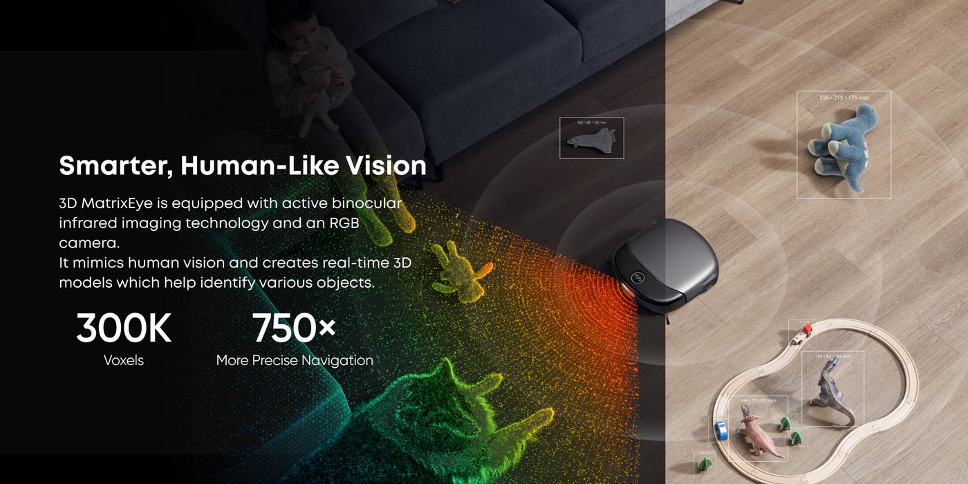 3D MatrixEye is equipped with active binocular infrared imaging technology and an RGB camera. It mimics human vision and creates real-time 3D models which help identify various objects.