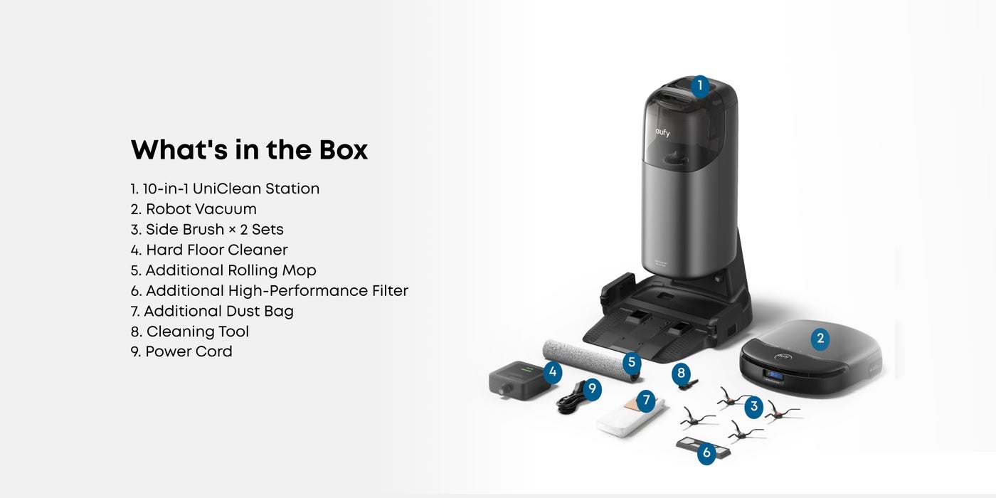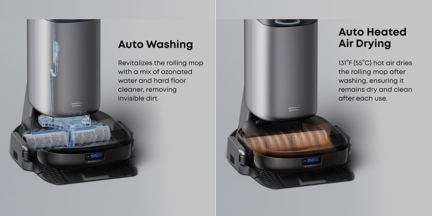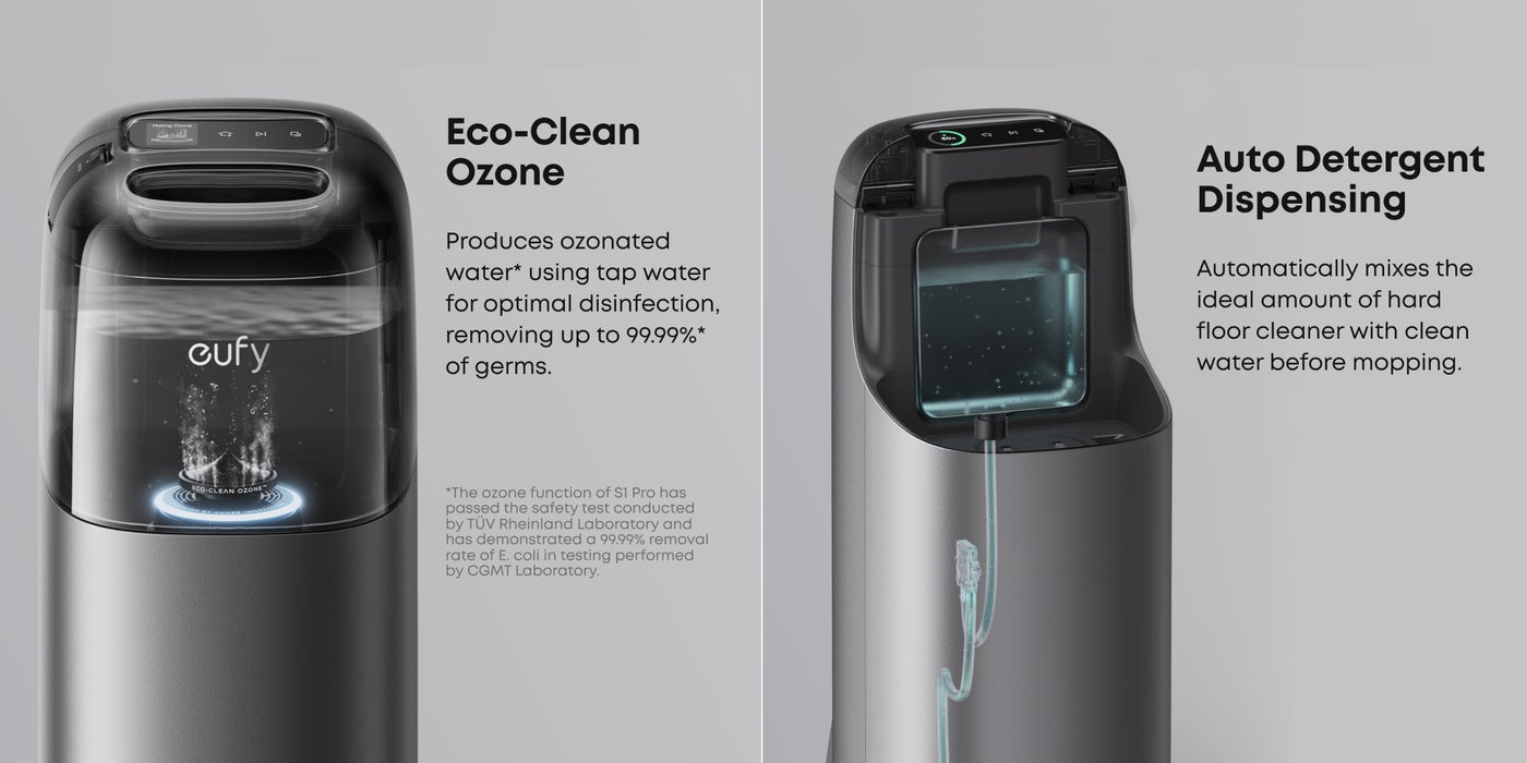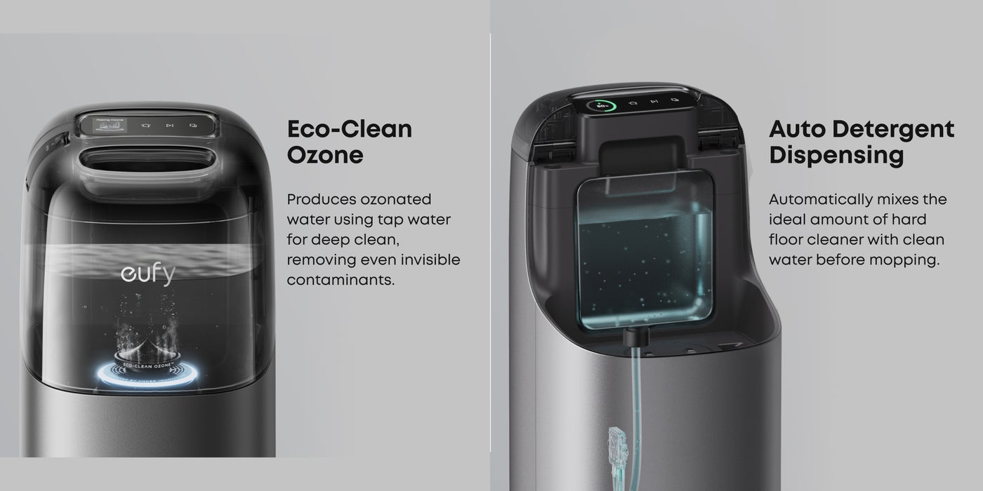 Offers auto emptying, auto washing, auto refilling, auto heated air drying, Eco-Clean Ozone, auto waste water collection, auto detergent dispensing, LCD touch control, sealed dust bag and 20% faster charging*. Enjoy no-hassle cleaning with this 10-in-1 powerhouse, for automated and effortless maintenance. *Based on eufy internal test, 20% faster charging compared to the previous generation product.