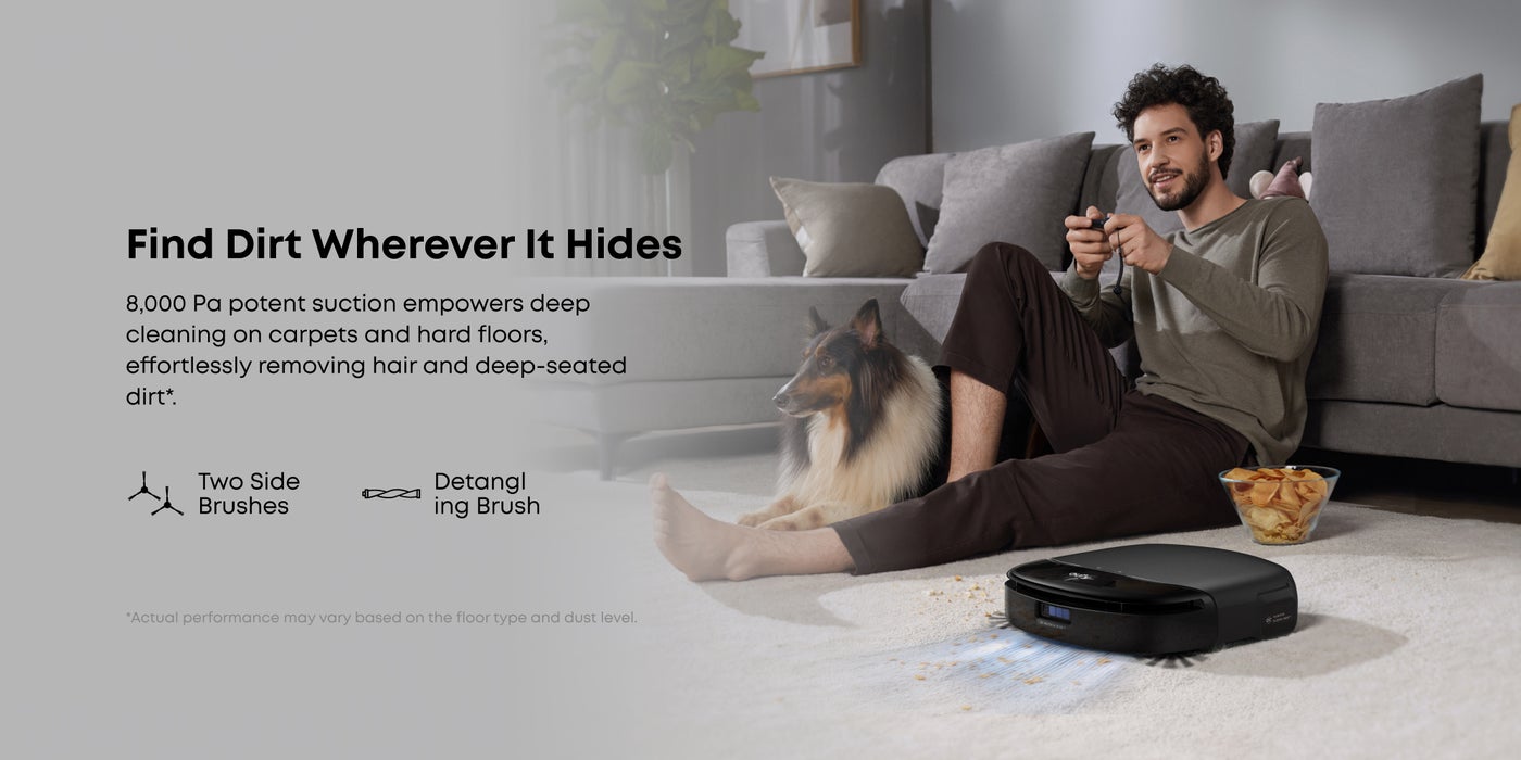 8,000 Pa potent suction empowers deep cleaning on carpets and hard floors, effortlessly removing hair and deep-seated dirt*. *Actual performance may vary based on the floor type and dust level.