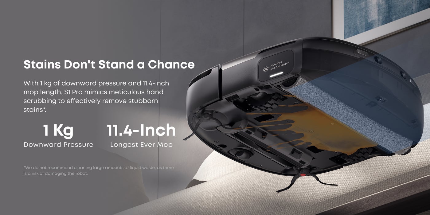 Introducing our cutting-edge Always Clean Mop that refreshes itself in real time at 170 RPM, which cannot be achieved by human hands, ensuring all-around cleaning. With 1 kg of downward pressure and 11.4-inch mop length, S1 Pro mimics meticulous hand scrubbing to effectively remove stubborn stains*. *We do not recommend cleaning large amounts of liquid waste, as there is a risk of damaging the robot.
