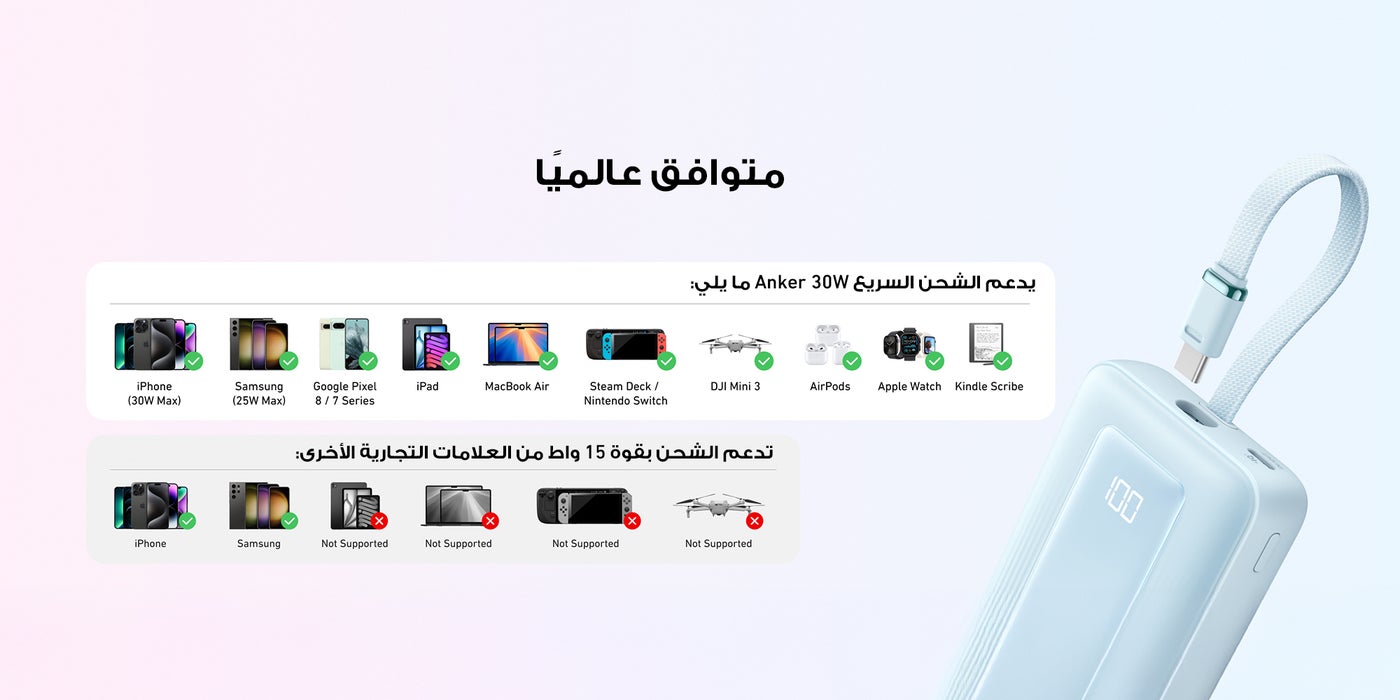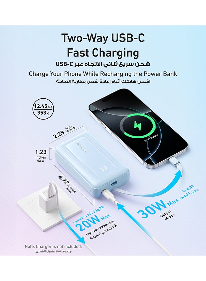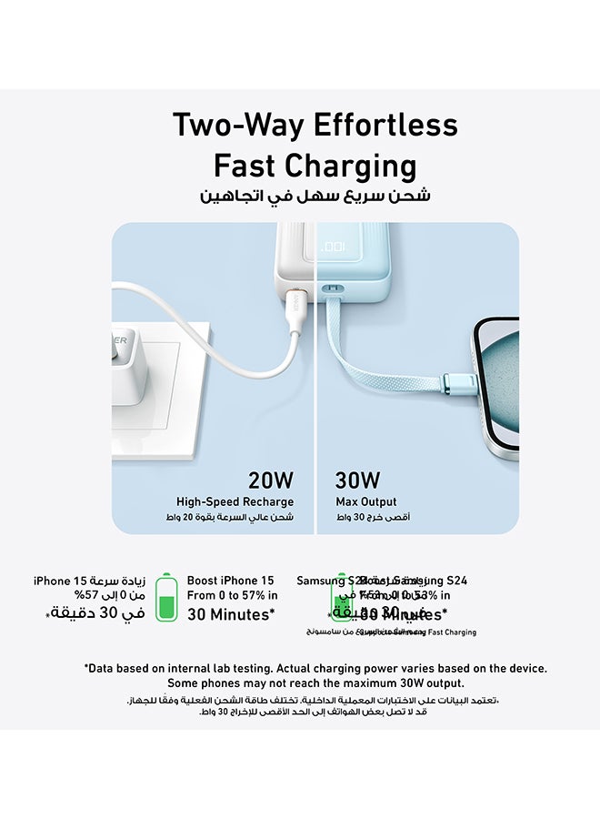 30W Two-Way Fast Charging: Charge quickly with 30W output and recharge just as fast with 20W input, keeping your devices ready in no time. Boost an iPhone 15 from 0 to 57% in just 30 minutes.