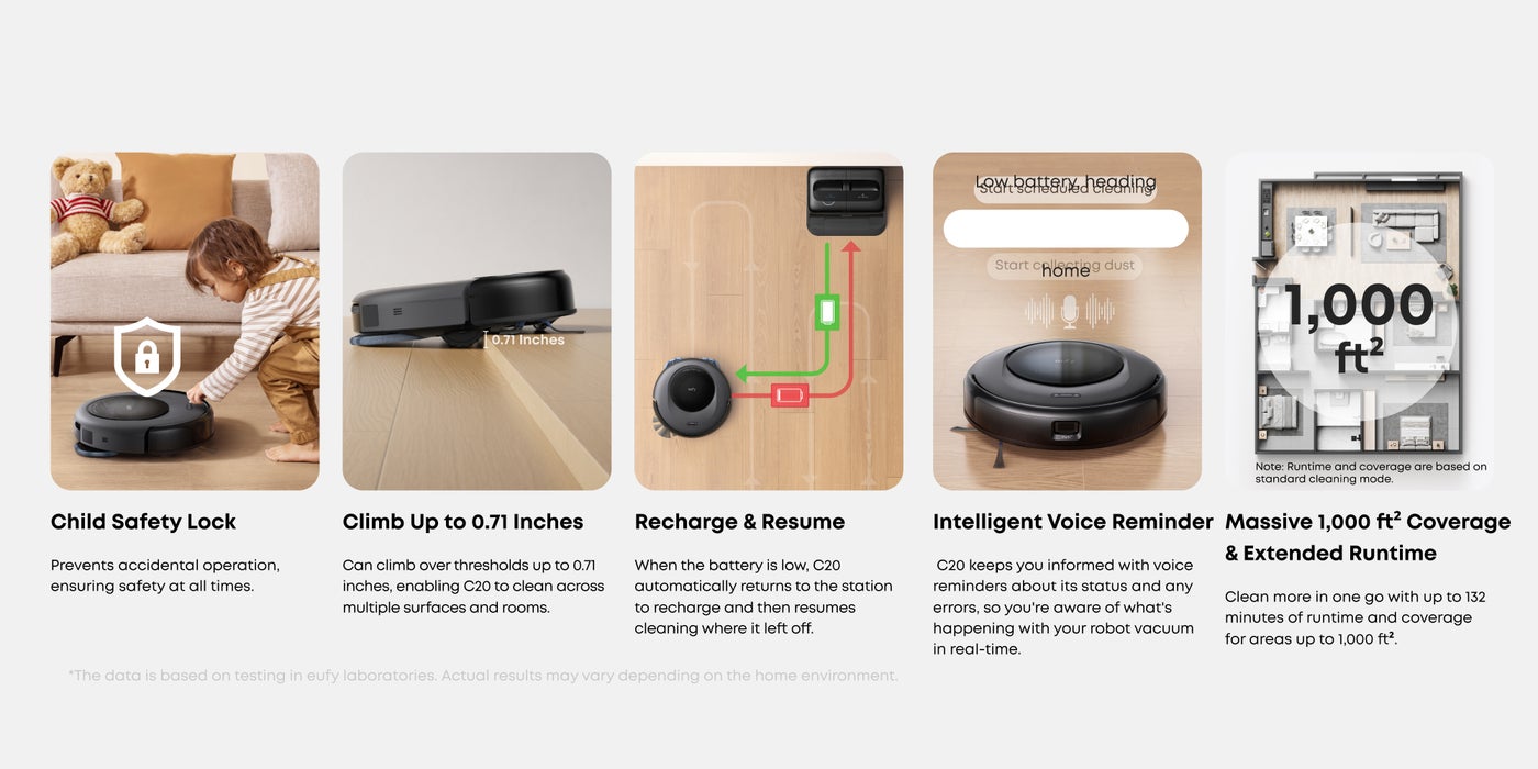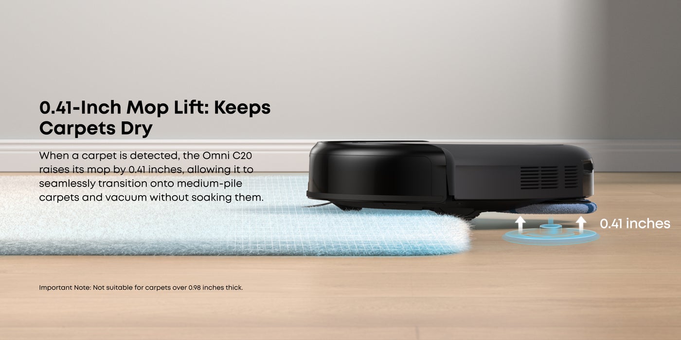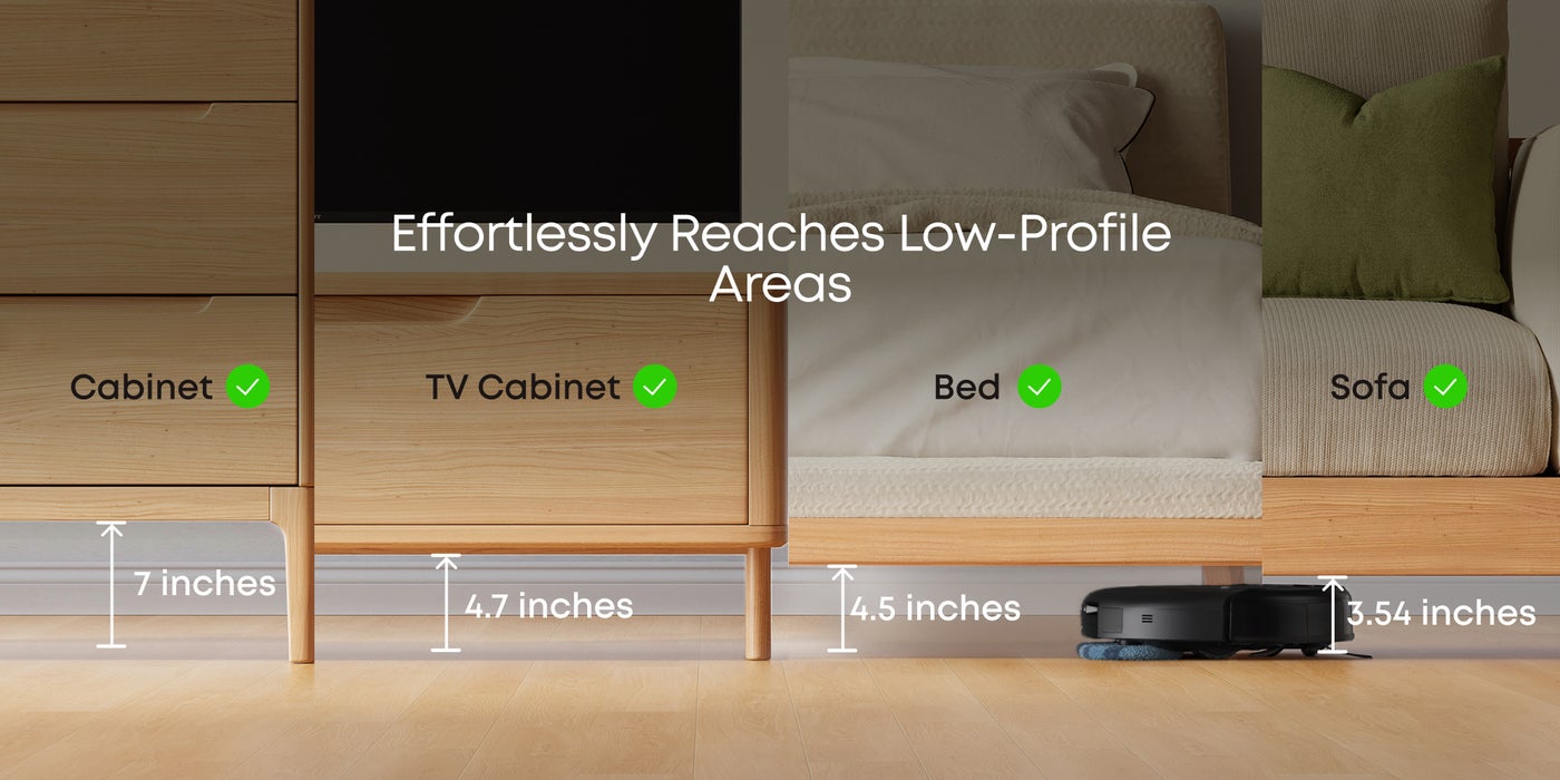 3.35-inch Ultra-Slim Body: Its ultra-slim 3.35-inch design allows the C20 to reach tight spaces, like under desks and beds, ensuring thorough cleaning in hard-to-reach areas and reducing manual cleaning in low-profile furniture spaces.