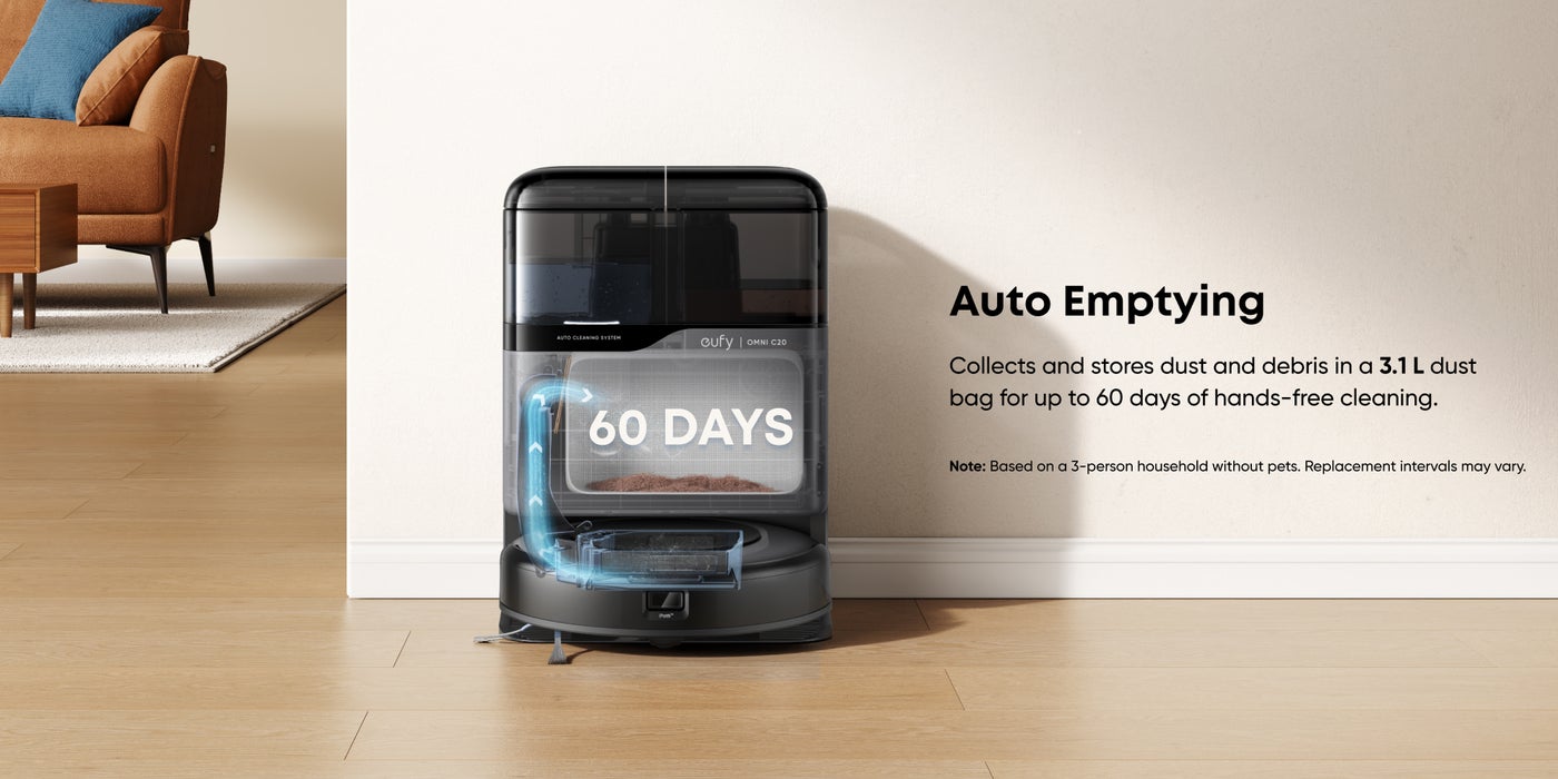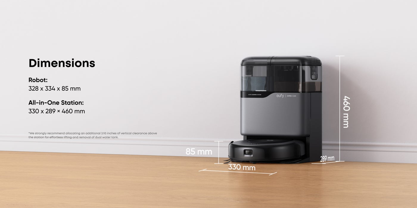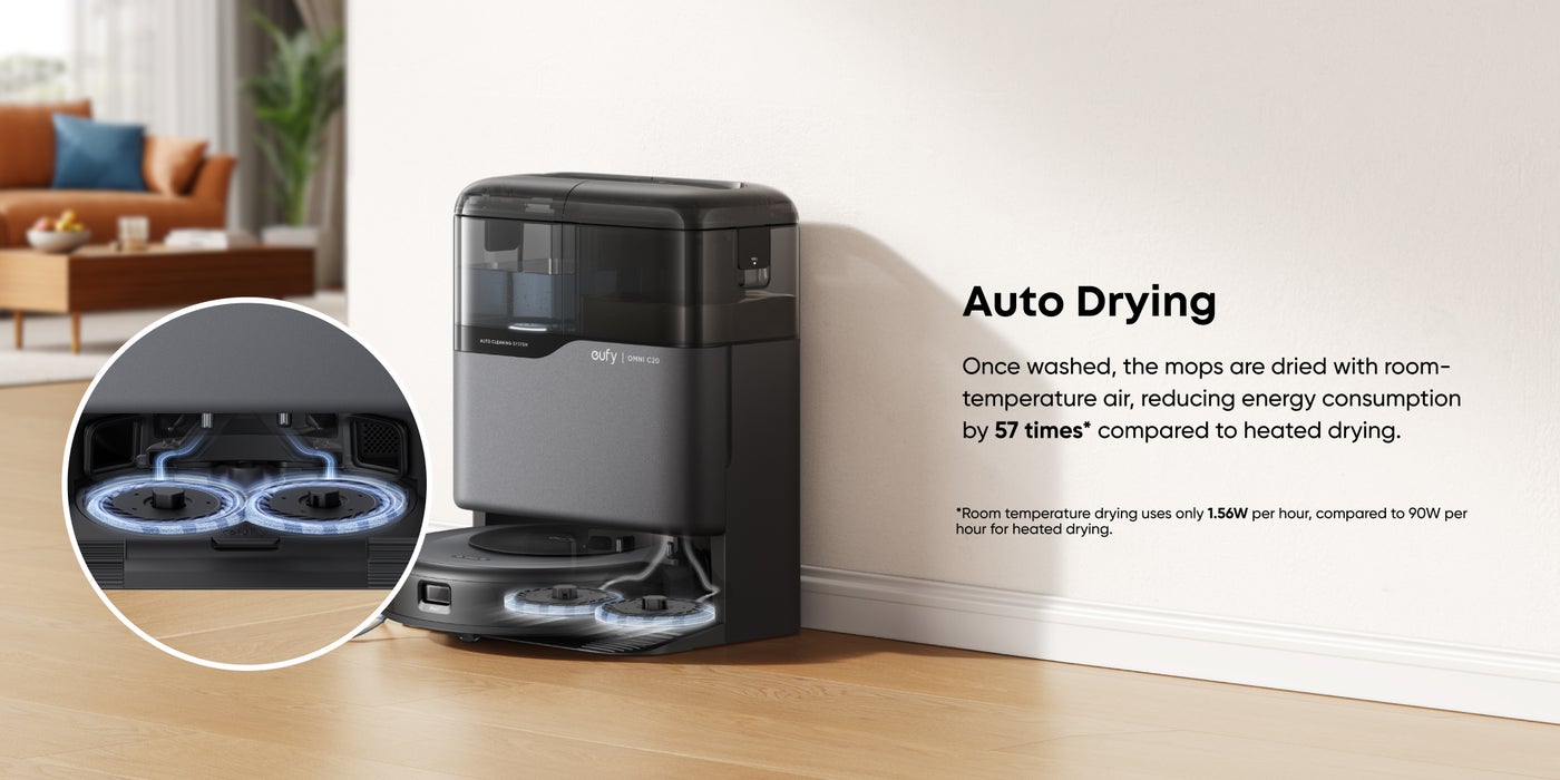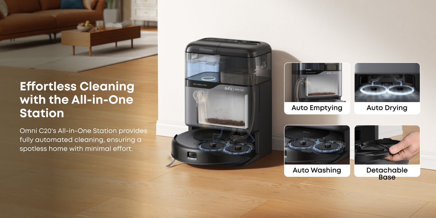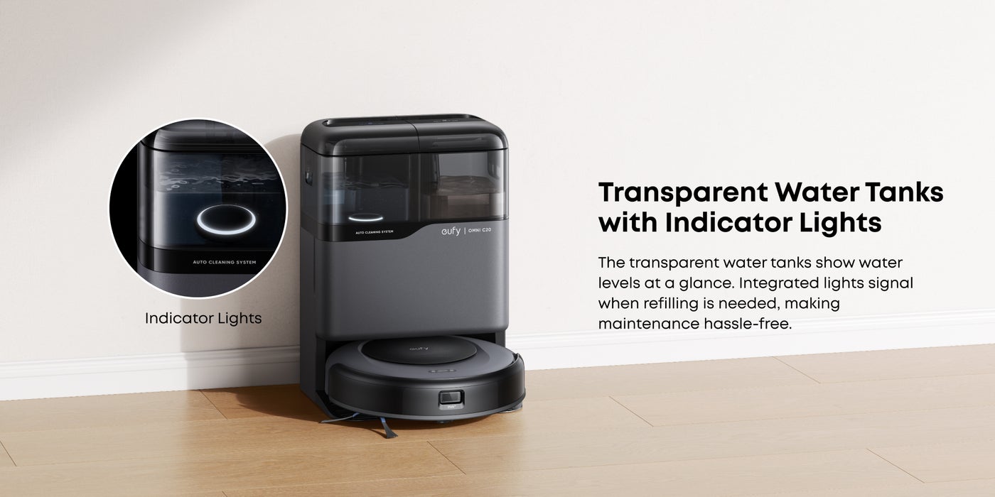 All-in-One Station: eufy Robot Vacuum Omni C20 offers fully automated cleaning with features like auto emptying, washing, drying, and water refilling. The station dries the mop with room-temperature air and has transparent water tanks, allowing you to easily monitor water levels without opening them. This hands-free system ensures effortless maintenance.