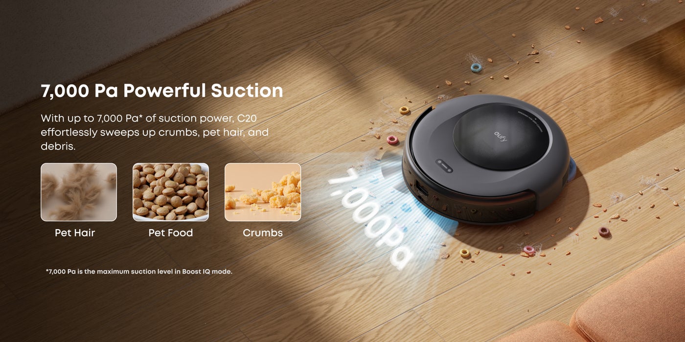 7,000 Pa Powerful Suction: Equipped with a robust 7,000 Pa suction, a rolling brush, and a side brush, C20 efficiently tackles dirt, crumbs, pet hair, and debris.