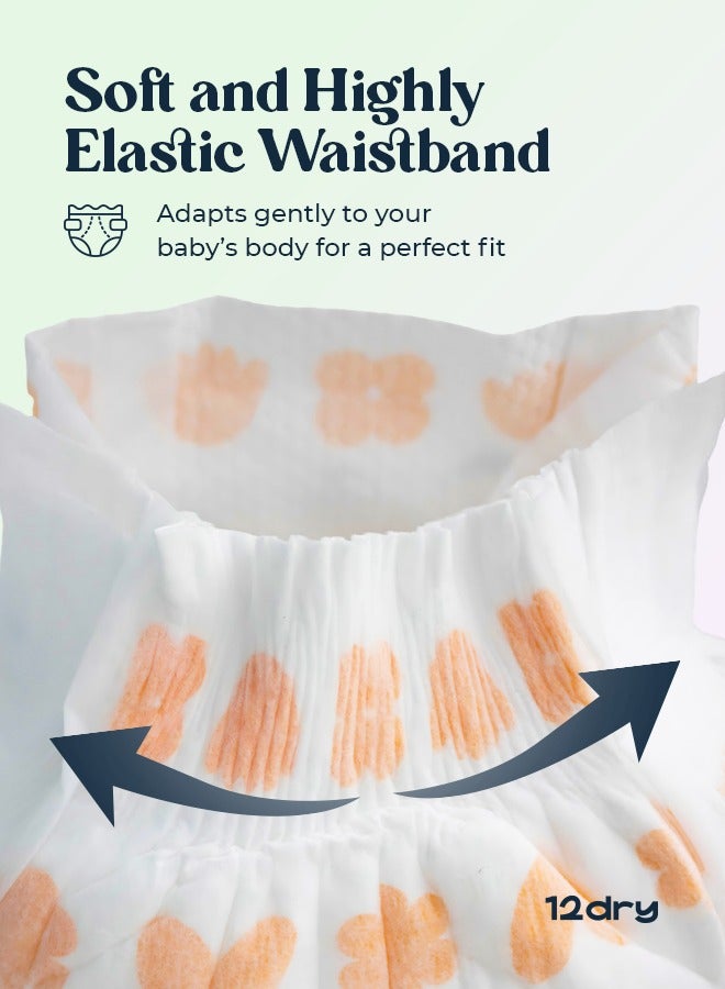 12dry diapers are designed with advanced Japanese absorbent technology to keep your baby dry and comfortable. The highly absorbent core locks in moisture, absorbing 47% more liquid than leading brands. This helps prevent leaks and reduces the risk of diaper rash, providing long-lasting dryness both day and night.