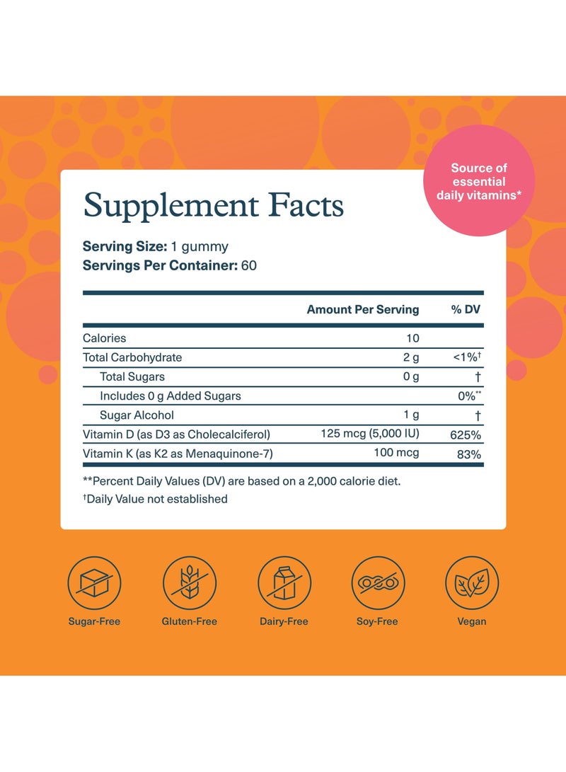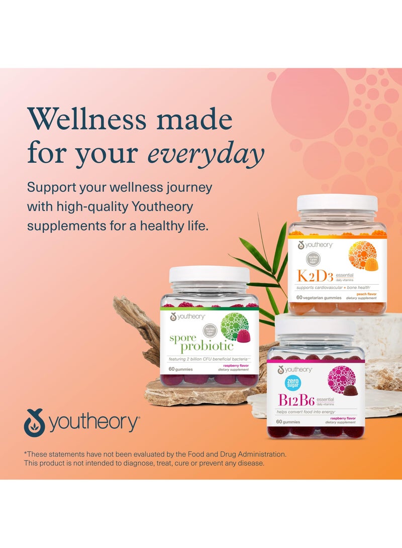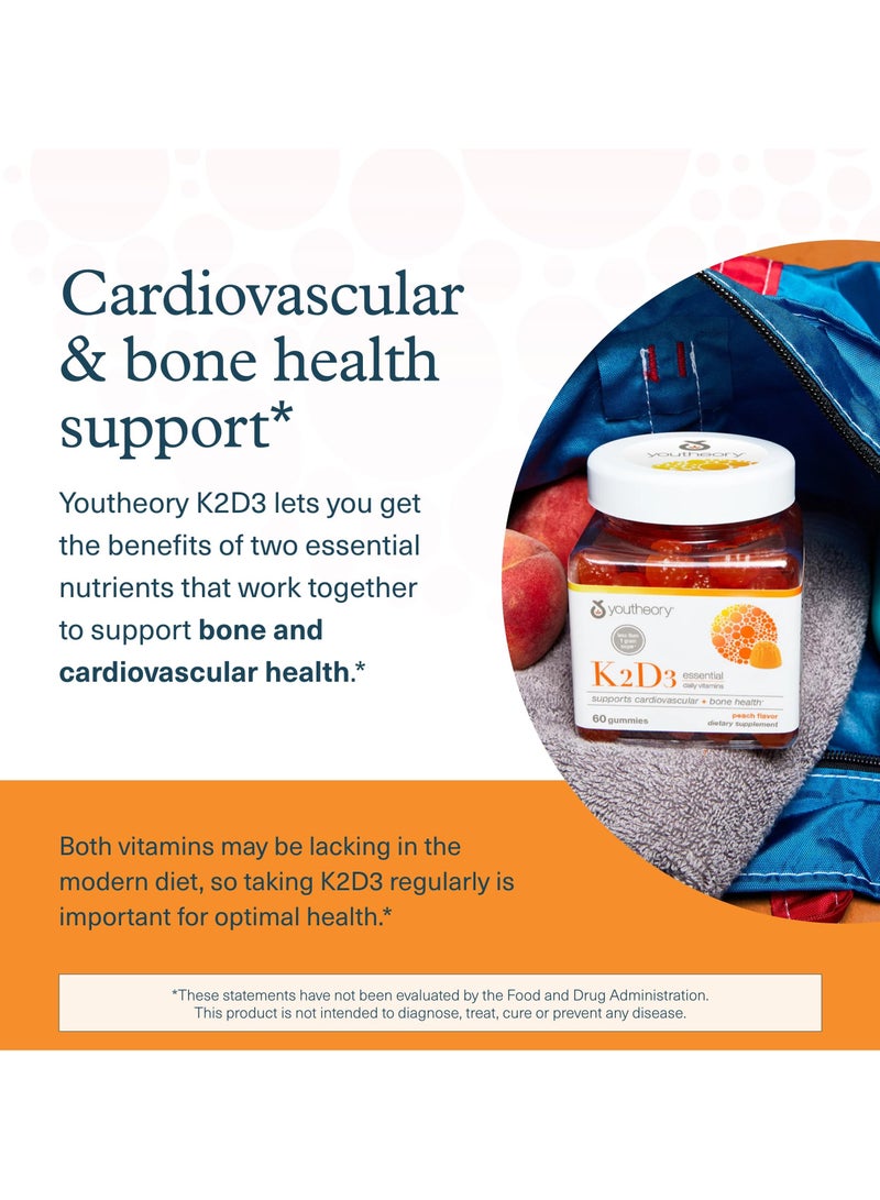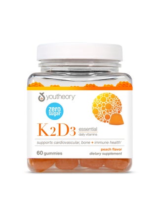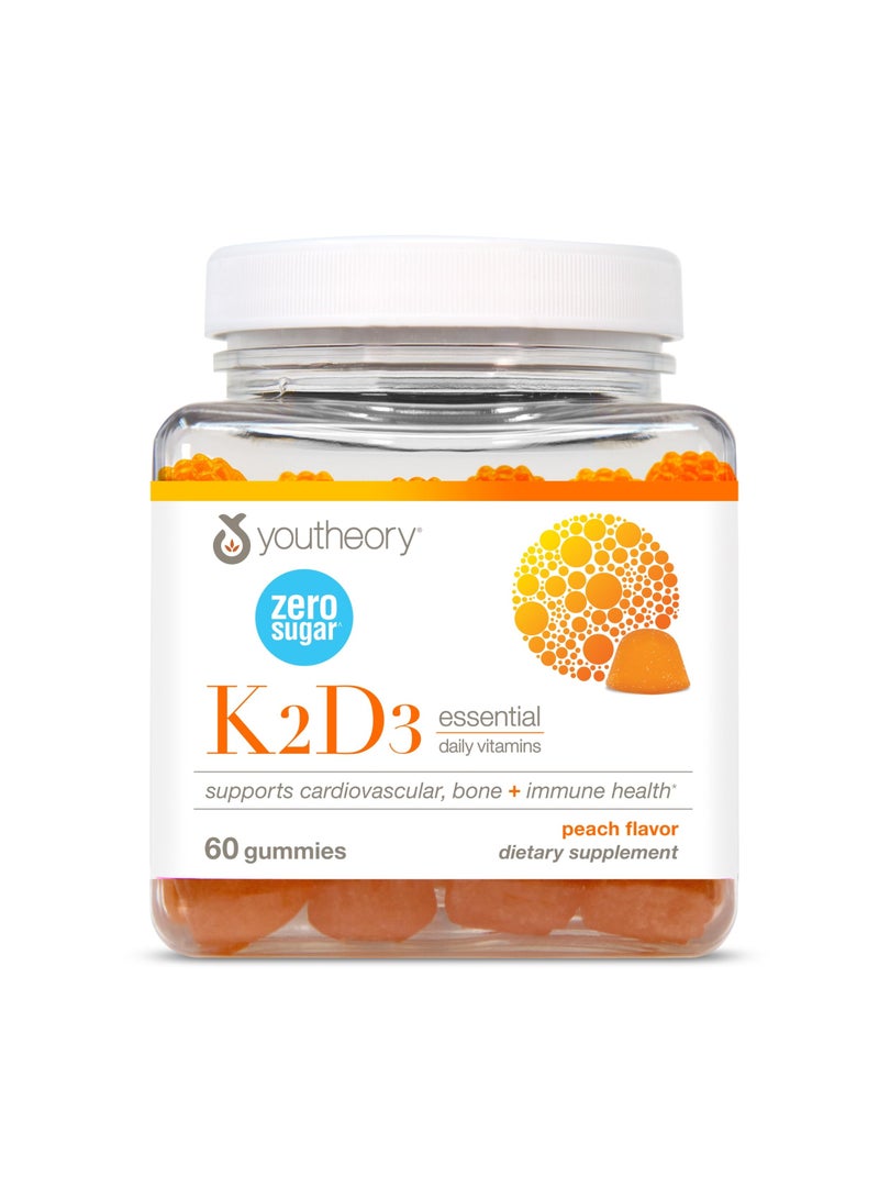 Embark on a journey towards optimal wellness with Youtheory's K2D3 zero sugar gummies, the dietary supplement designed to harmonize heart function and fortify bone structure. Infused with a blend of vitamin D3 and vitamin K2, our formula is crafted to support calcium absorption. Our commitment to purity means you receive a product that seamlessly integrates into your daily routine, providing the bone support and heart health nourishment you deserve. The ease of our capsules allows you to enjoy the benefits of these essential vitamins. Embrace this daily vitamin as part of your daily ritual, and let the science-backed blend work to support the health of your bones and heart. With Youtheory, you're choosing a lifestyle that's empowered, nourished, and always moving forward toward the pinnacle of health. Creating supplements of the utmost quality and efficacy is easier said than done. It takes commitment and accountability at every stage. It means traveling the world to source the highest quality raw materials. It means manufacturing every product in-house in our GMP-certified facility. It means testing every product beyond the industry standards. And that's just the beginning. From farm to shelf, we're committed to best-in-class manufacturing processes, guaranteed purity, potency and traceability of every product. Everything we do is based on a dedication to build pure, safe and effective supplements to support our mission to inspire wellness in all. We believe that by creating products that embody the best that science and nature can offer, looking and feeling your best at every stage of life can become a way of life.