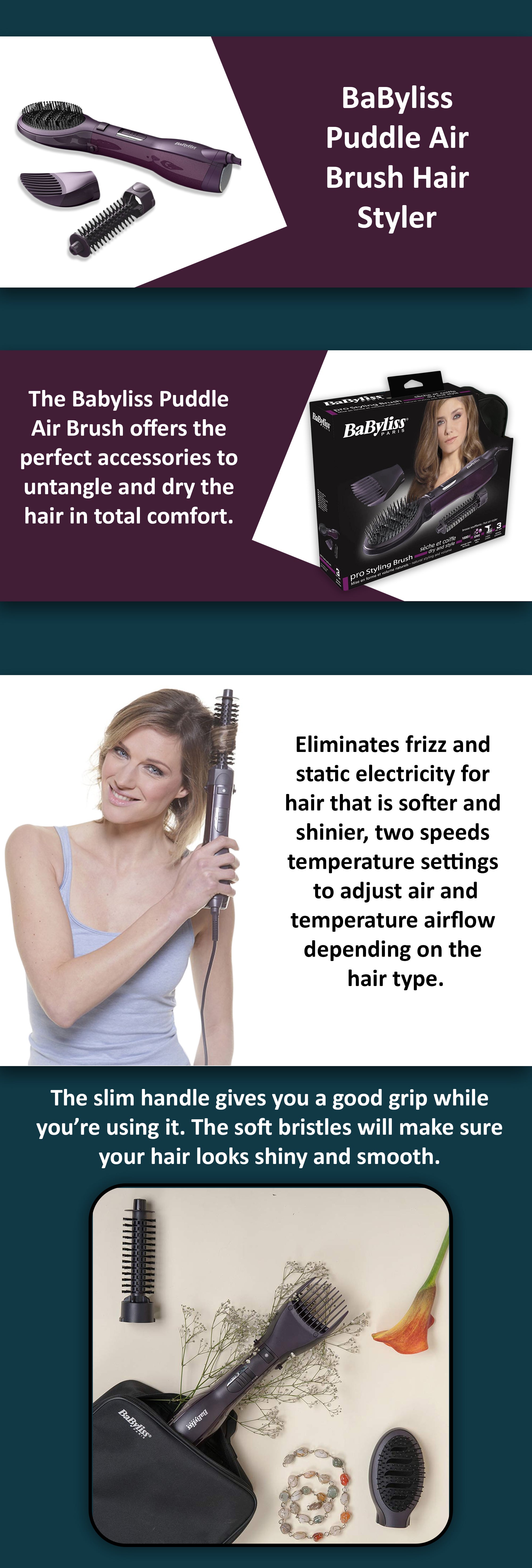 The BaByliss AS115SDE Airstylers Paddle Air ush is the perfect choice for your hair as it dries and styles them effectively. It has the boost of the Ionic function that helps in eliminating static and frizz. This makes the hair silky and smooth. The two speed and temperature settings of this BaByliss Airstylers Paddle air ush allow you to set them at what is ideal for your hair. You can press the cool air button and style your hair strands effectively. Furthermore, the soft and rounded istles do not harm your locks. They enhance the softness and beauty of your hair. The nozzle of this BaByliss hair styling appliance provides concentrated styling. Key Features 2 Speeds eliminates frizz 1000 Watts Frizz-free and Smooth Hair Thanks to the BaByliss Airstylers Paddle air ush, you can have smooth and beautiful hair. Its Ionic function swiftly and carefully detangles your locks and eliminates static electricity.