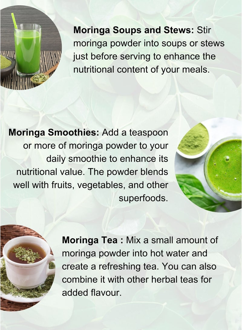 | Active Ingredients | Pure Moringa Oleifera Leaf Powder This powder is derived from Moringa oleifera leaves and utilizes shade drying technology. It is abundant in natural vitamins, minerals, amino acids, antioxidants, preservatives, and chlorophyll content. |