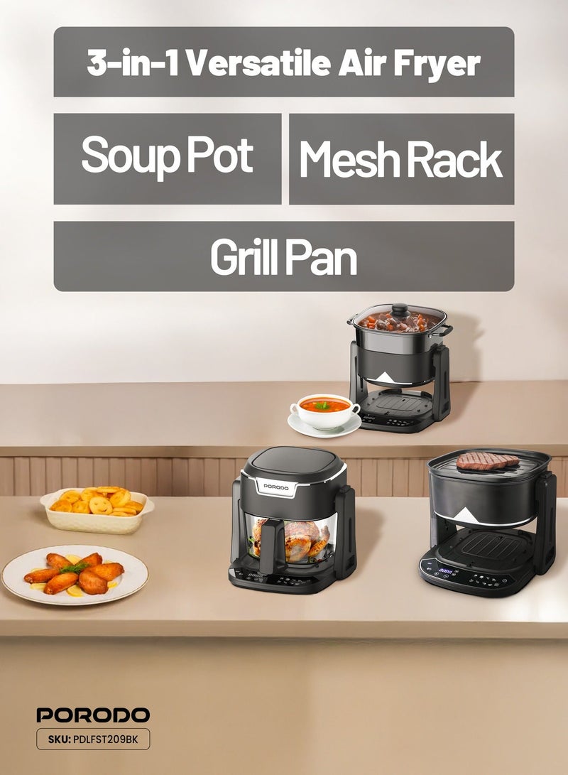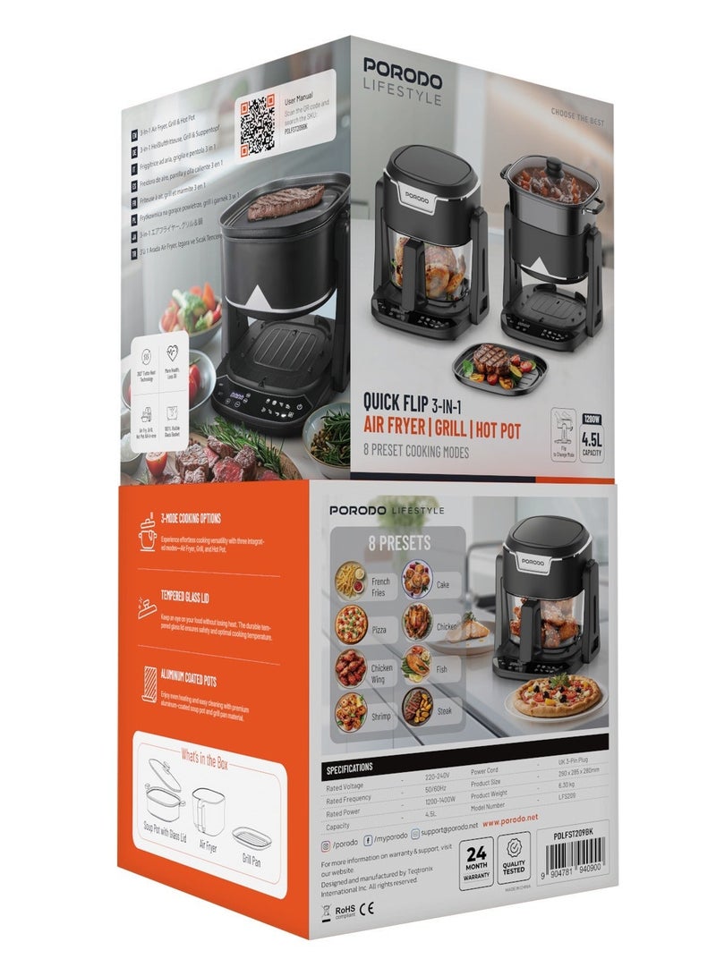 The Porodo Quick Flip 3 in 1 Air Fryer, Grill & Hot Pot combines three cooking functions into one versatile kitchen appliance. With a 4.5L capacity, it allows you to cook larger meals for family or friends, whether you're air frying, grilling, or using it as a hot pot for stews and soups. The 8 preset cooking modes make it easy to prepare a variety of dishes, while the 360° Turbo Heat Technology ensures even cooking and crisp results every time. The flip-to-change modes feature allows for quick adjustments, making cooking more convenient and efficient.