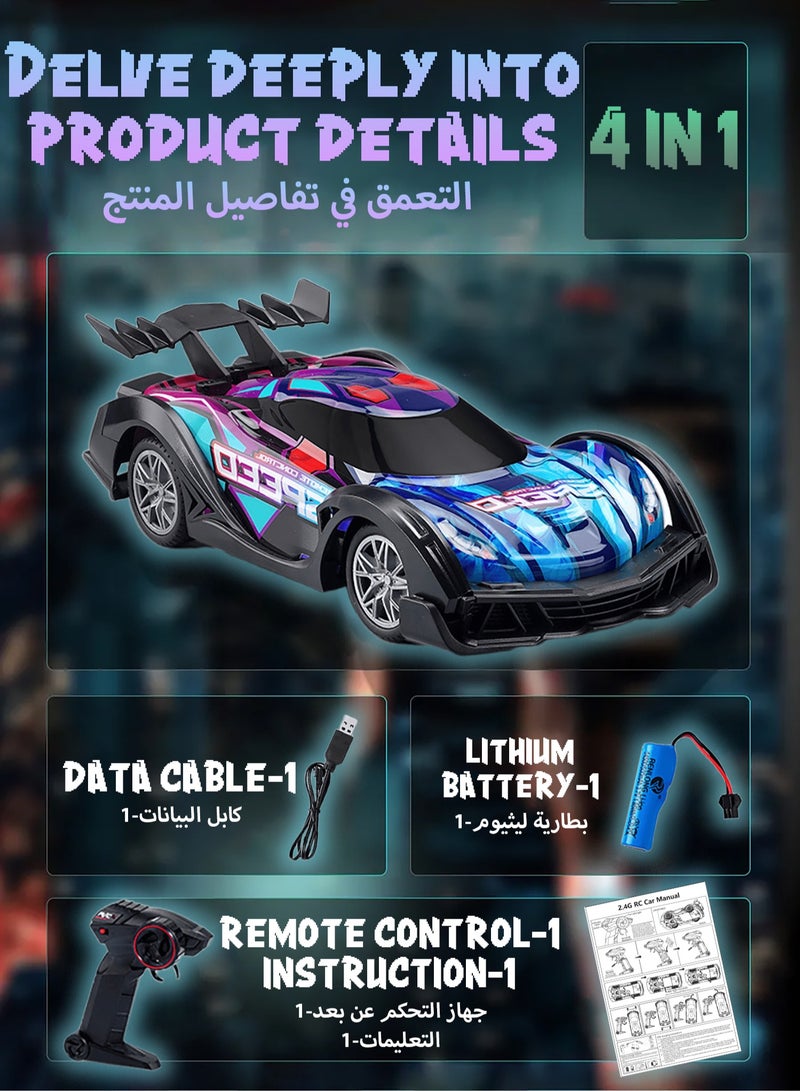 Cool LED Car Light-Our mini RC drift car is equipped with LED lights. When the switch is turned on, the lights will show the graffiti on the entire car body.The RC cars for kids can light up the dark night;